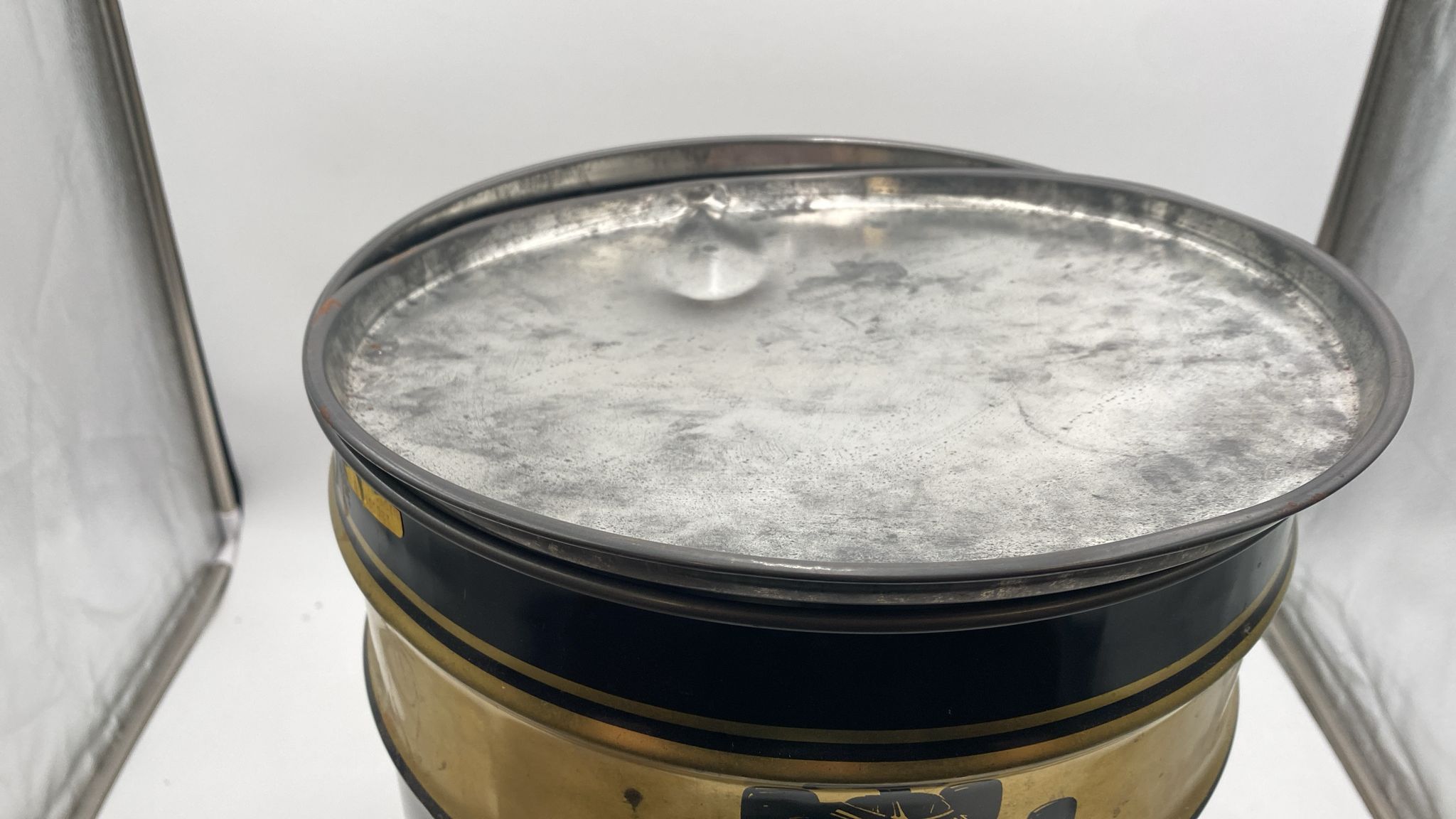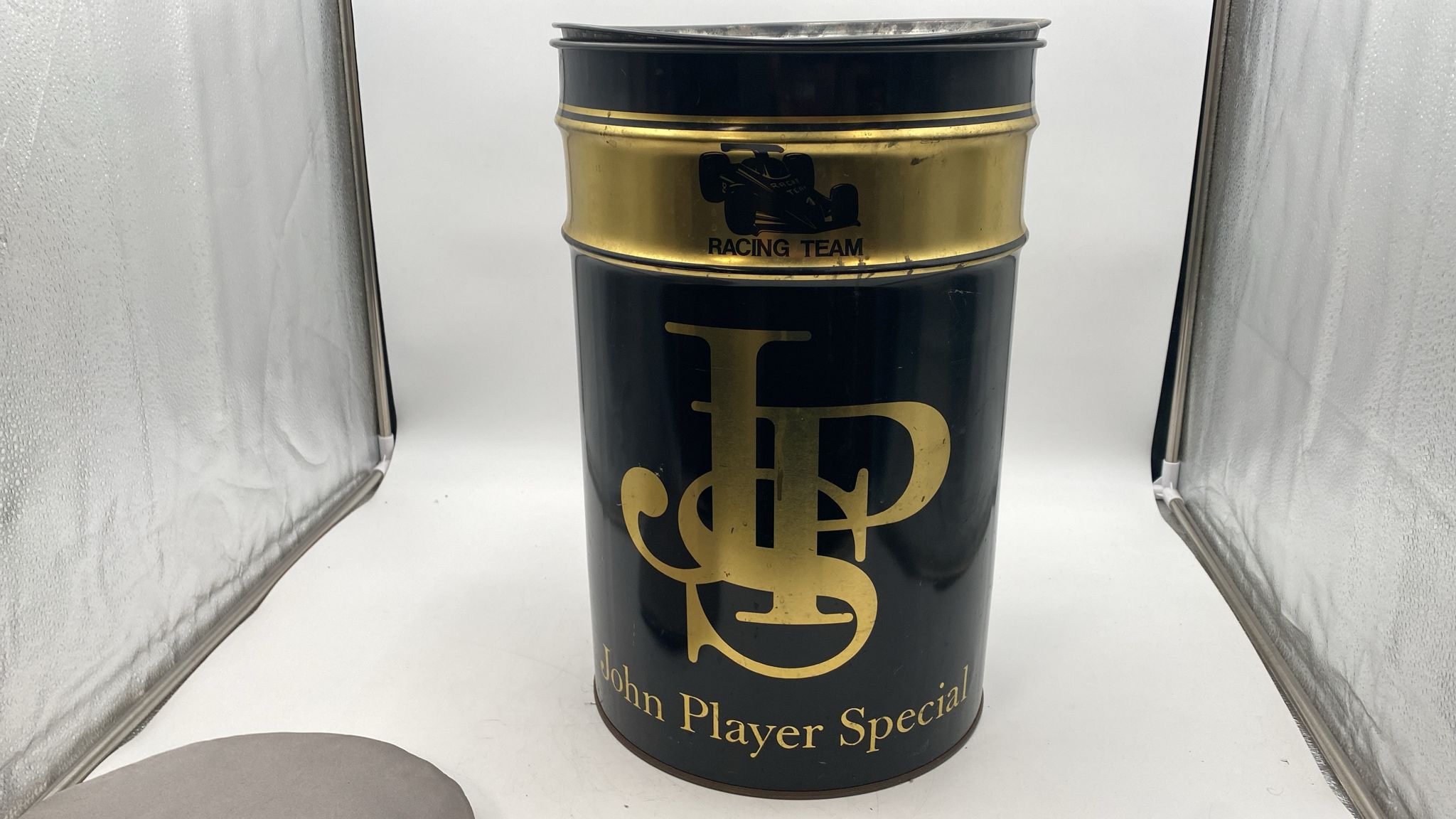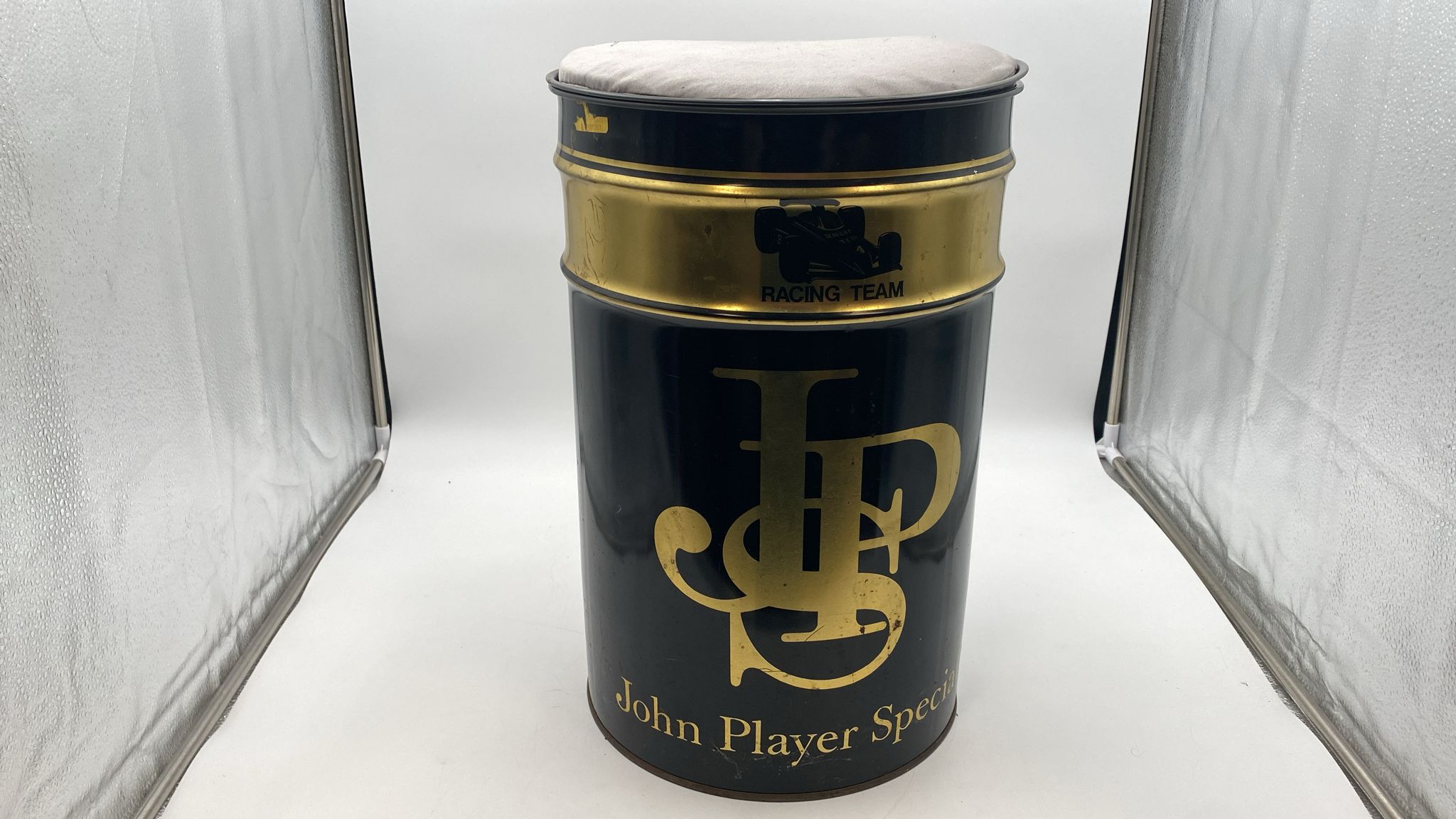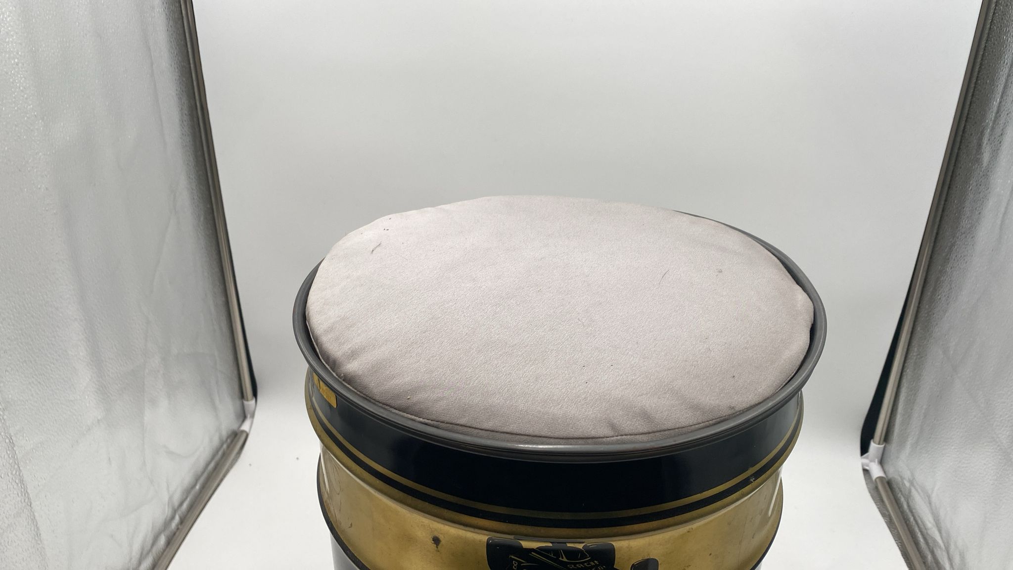 Bidone portaoggetti vintage completo di cuscino. Diametro 30 cm, altezza 45 cm