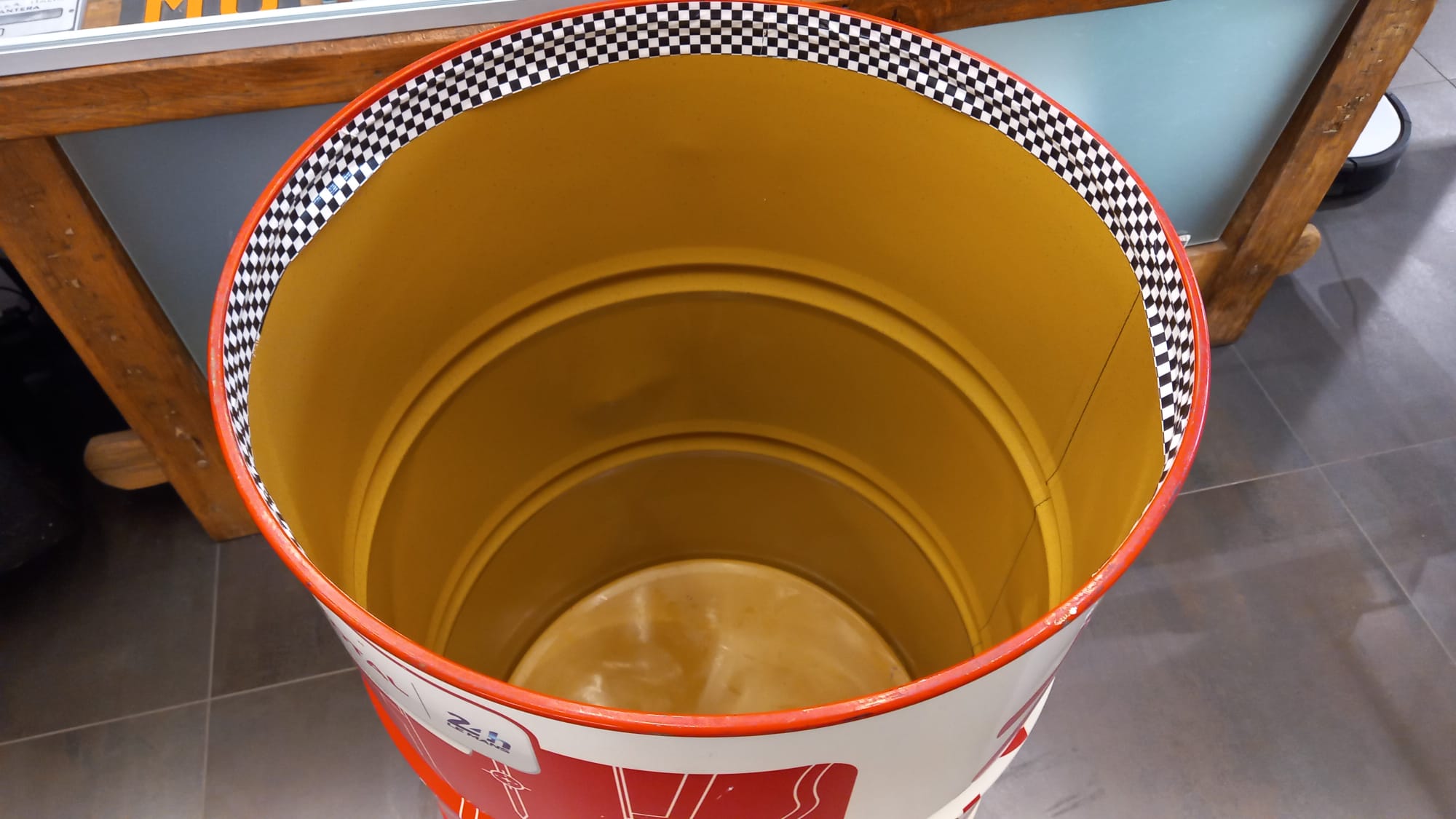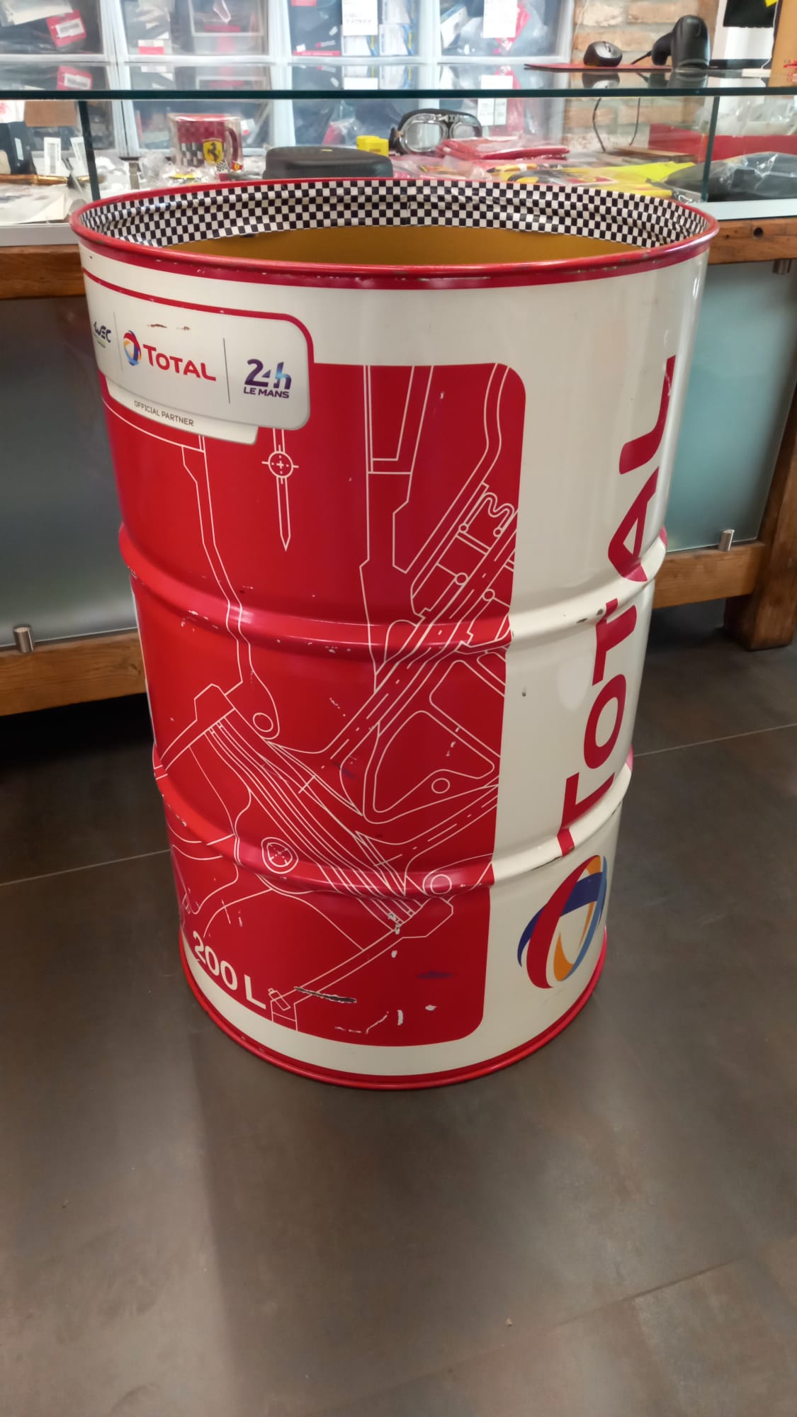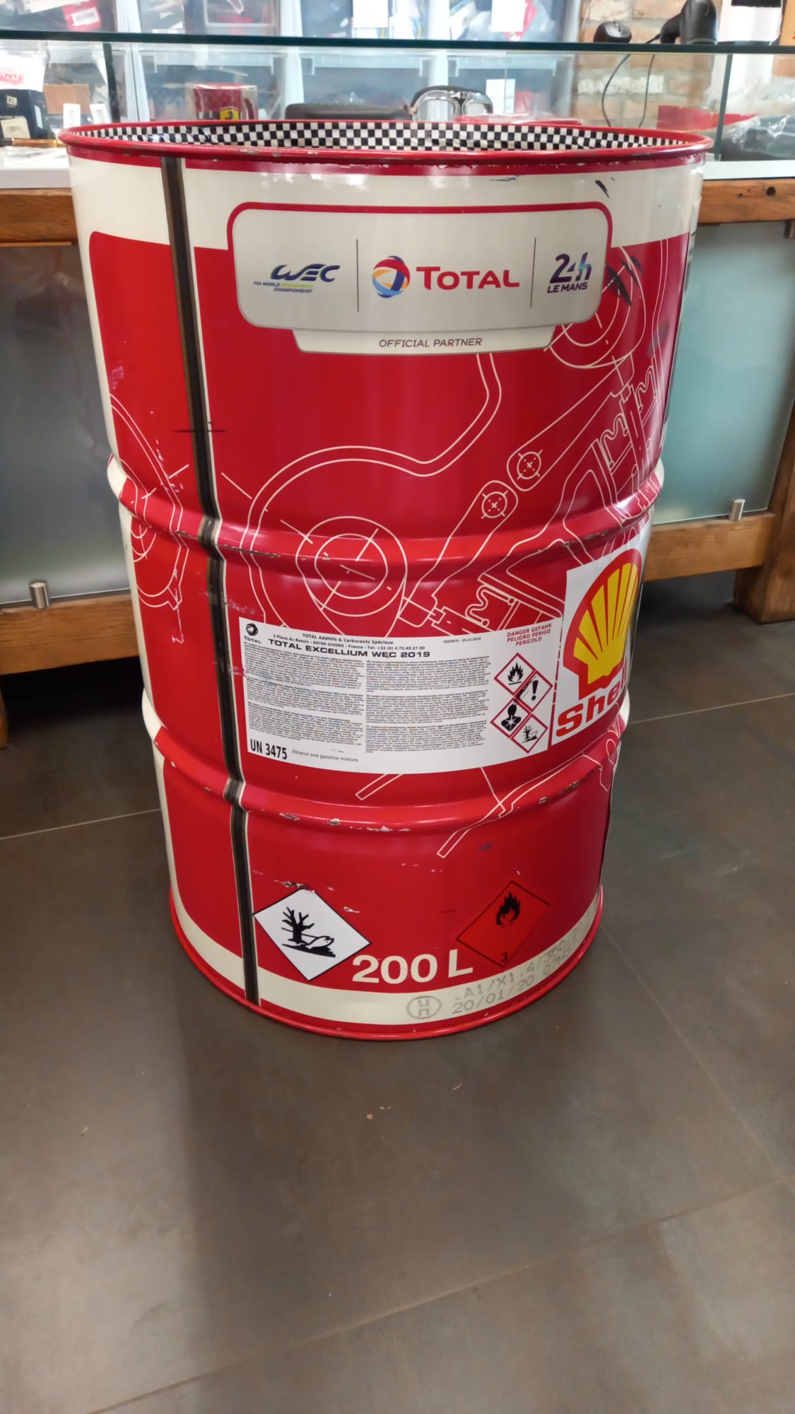 Barile originale Total a cui sono stati aggiunti foto Ferrari F1 e stemma Shell