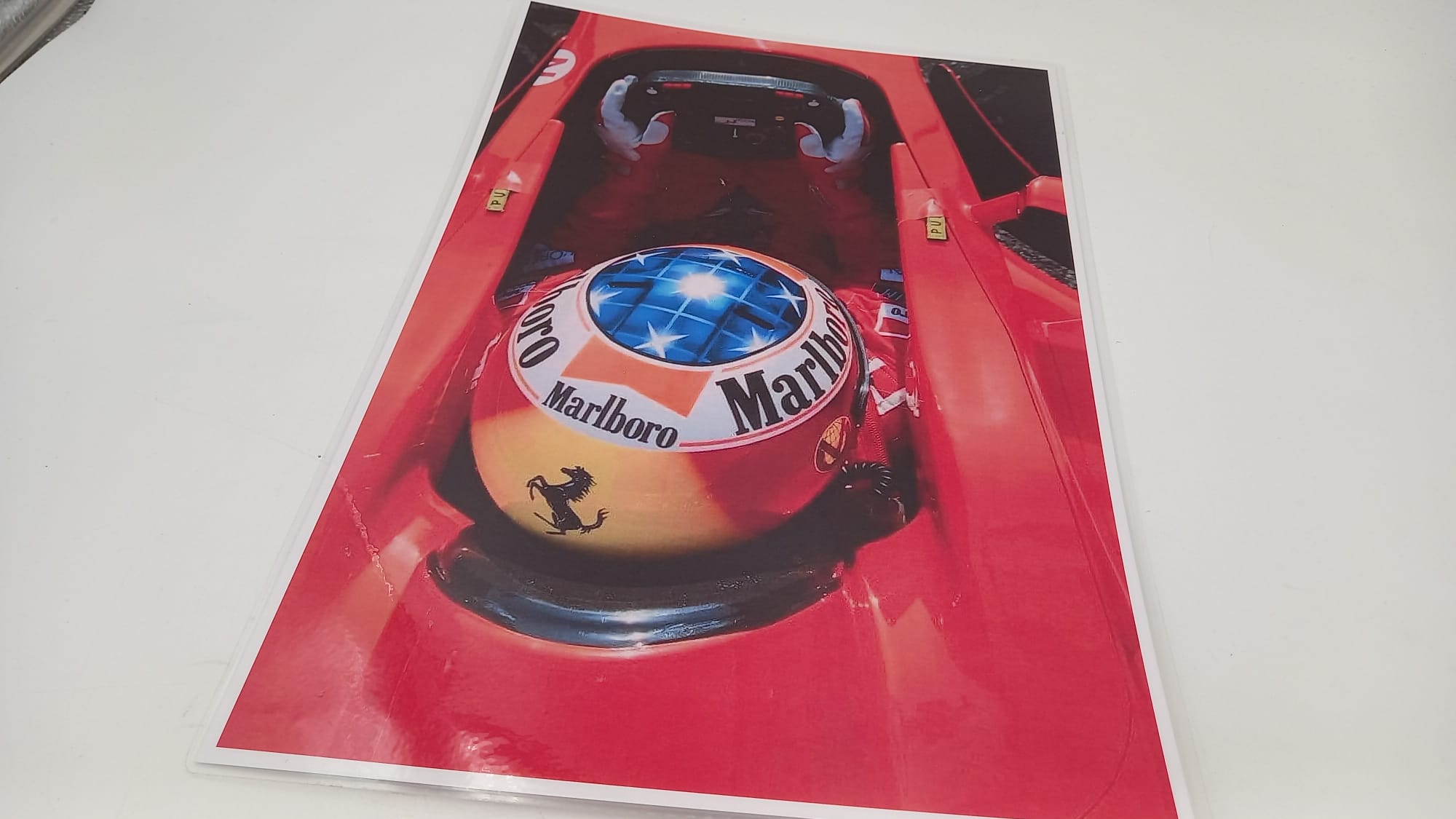 Stampa plastificata di Michael Schumacher nell' abitacolo della sua Ferrari F1 In ottime condizioni, misure 29 x 42 cm