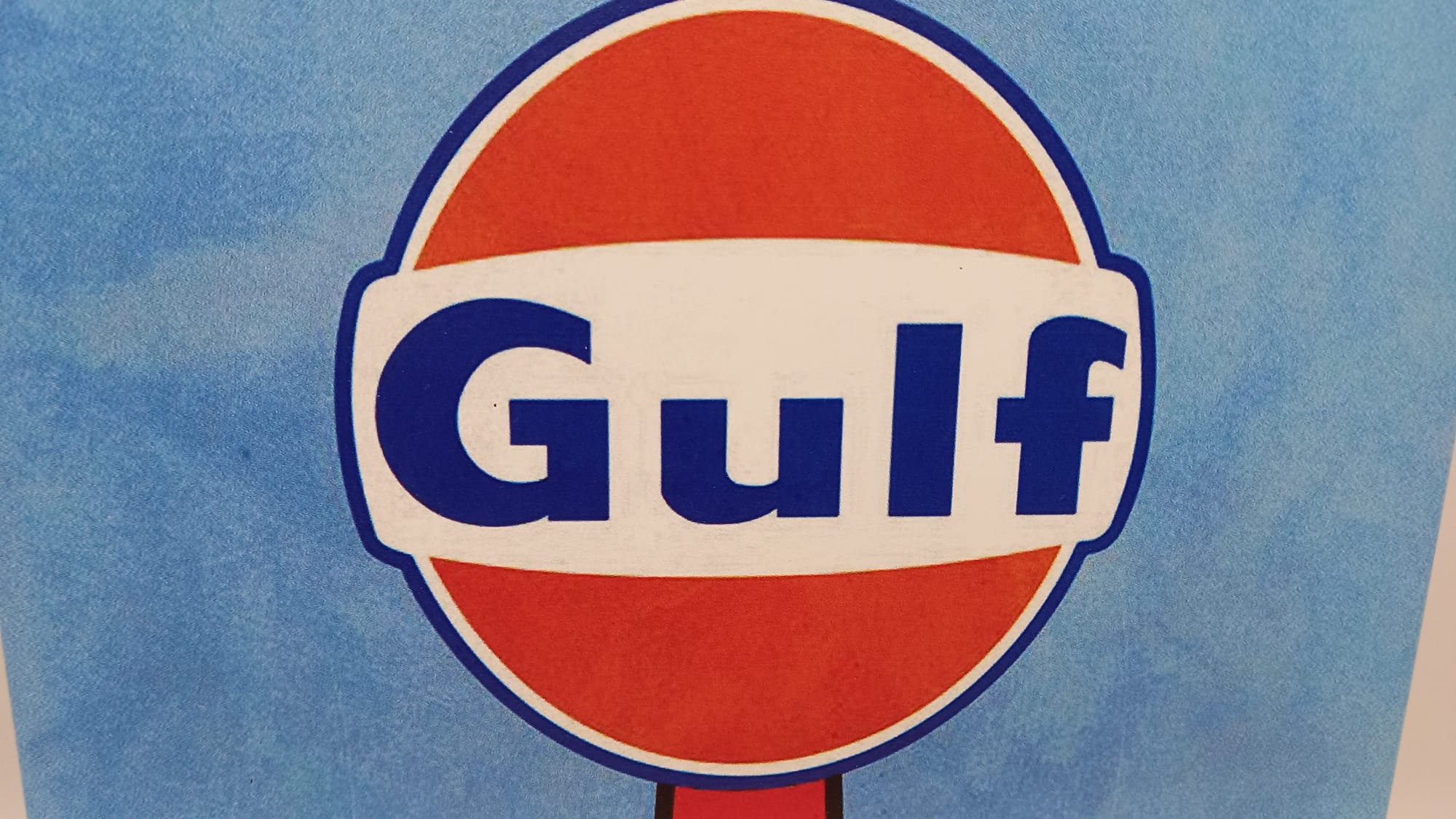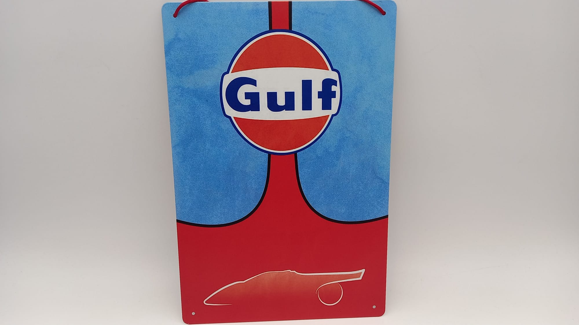 Targa in metallo riproducente il marchio e colori Gulf In perfette condizioni, misure 19,5 x 30 cm Già predisposta per essere appesa
