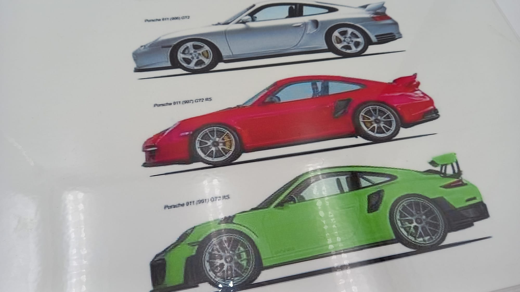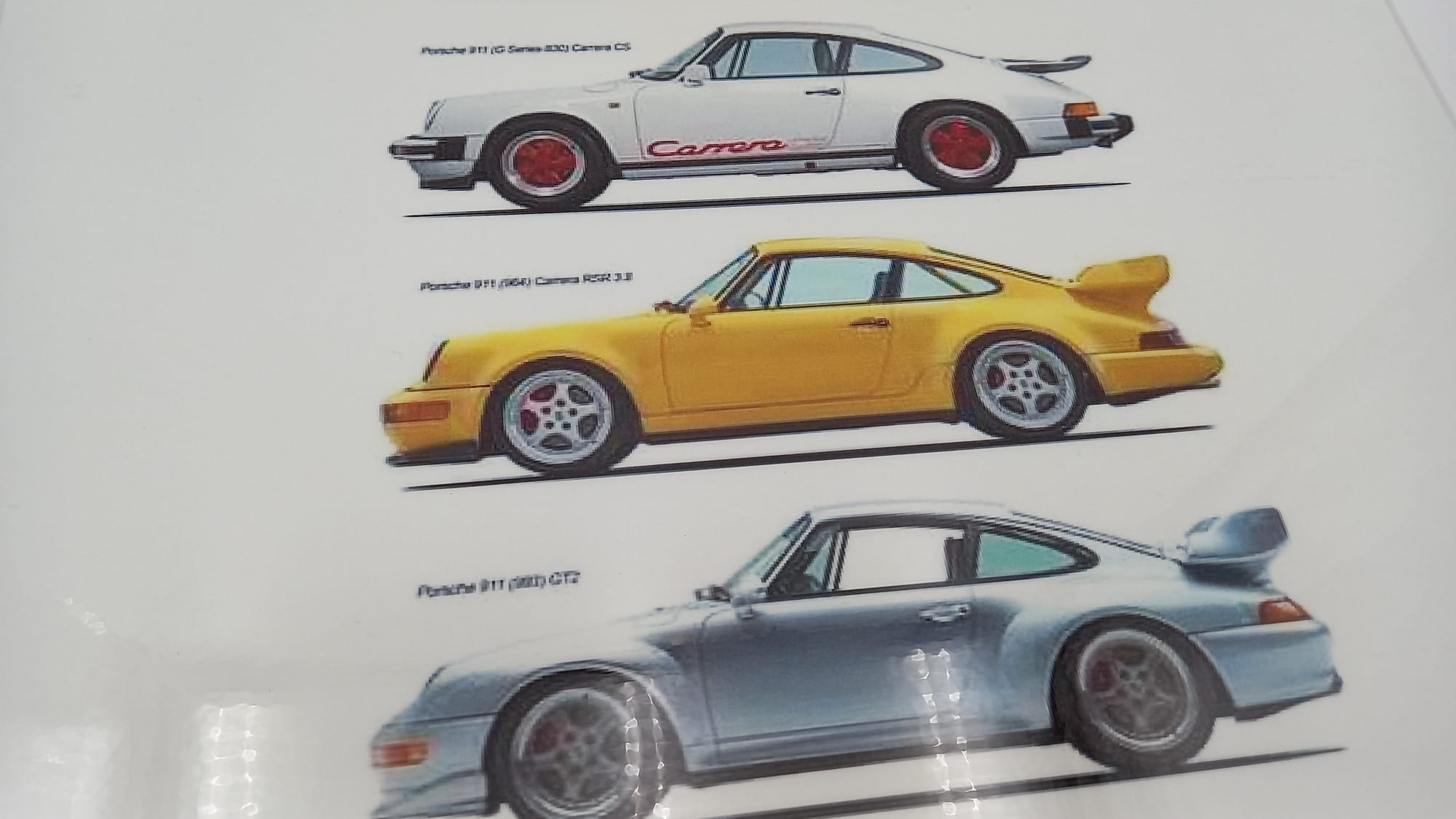 Stampa plastificata raffigurante diversi modelli Porsche In ottime condizioni, misure 30x42cm