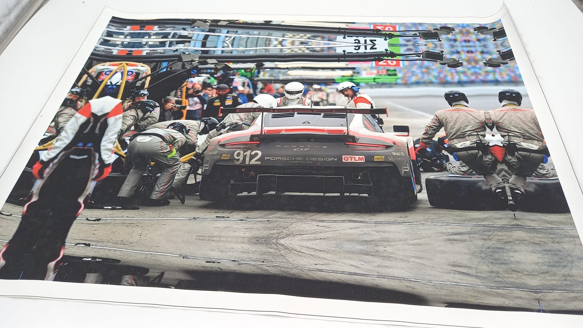 Stampa su tela di una Porsche 911 RSR impegnata in un pitstop Ottime condizioni, misure 43x58 cm