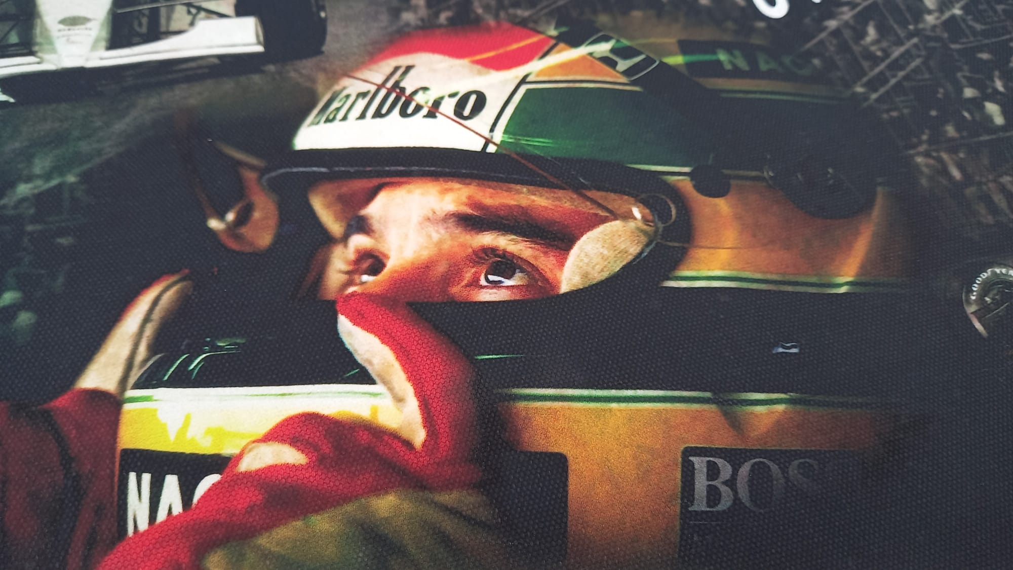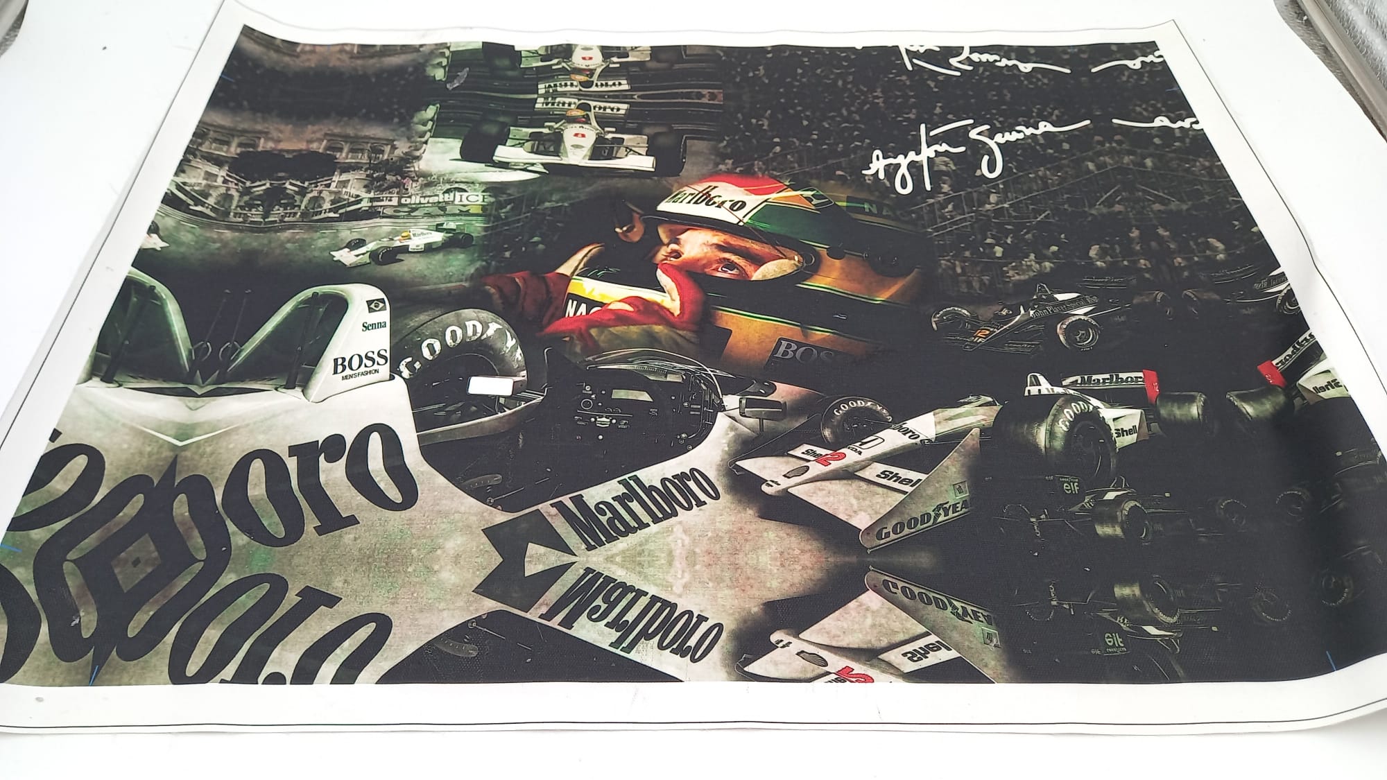 Stampa su tela commemorativa di Ayrton Senna e la sua McLaren in azione In ottime condizioni, misure 58x43 cm