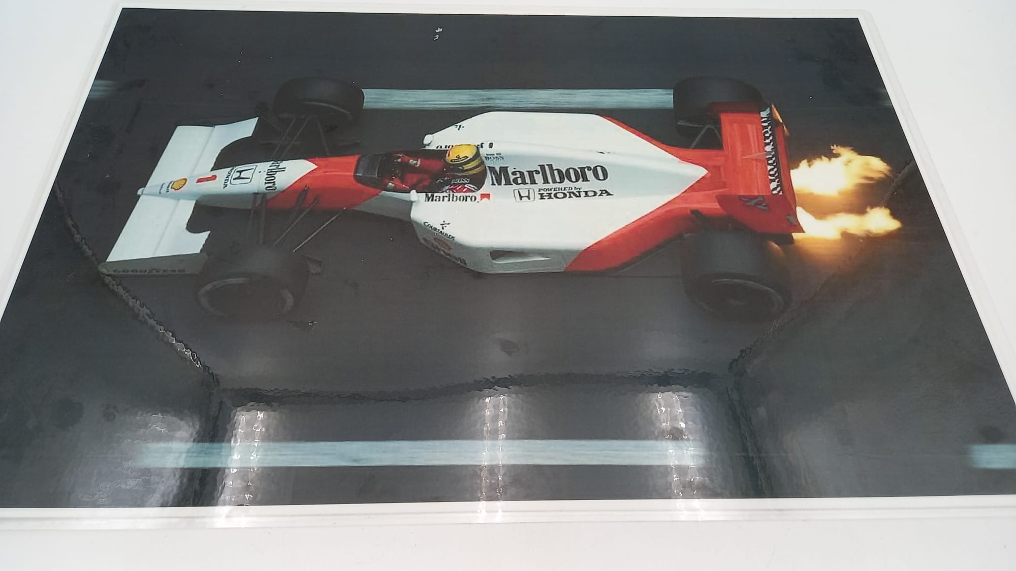 Stampa plastificata raffigurante Ayrton Senna su McLaren MP4/6 1991 In perfette condizioni, misure 42x28,5 cm