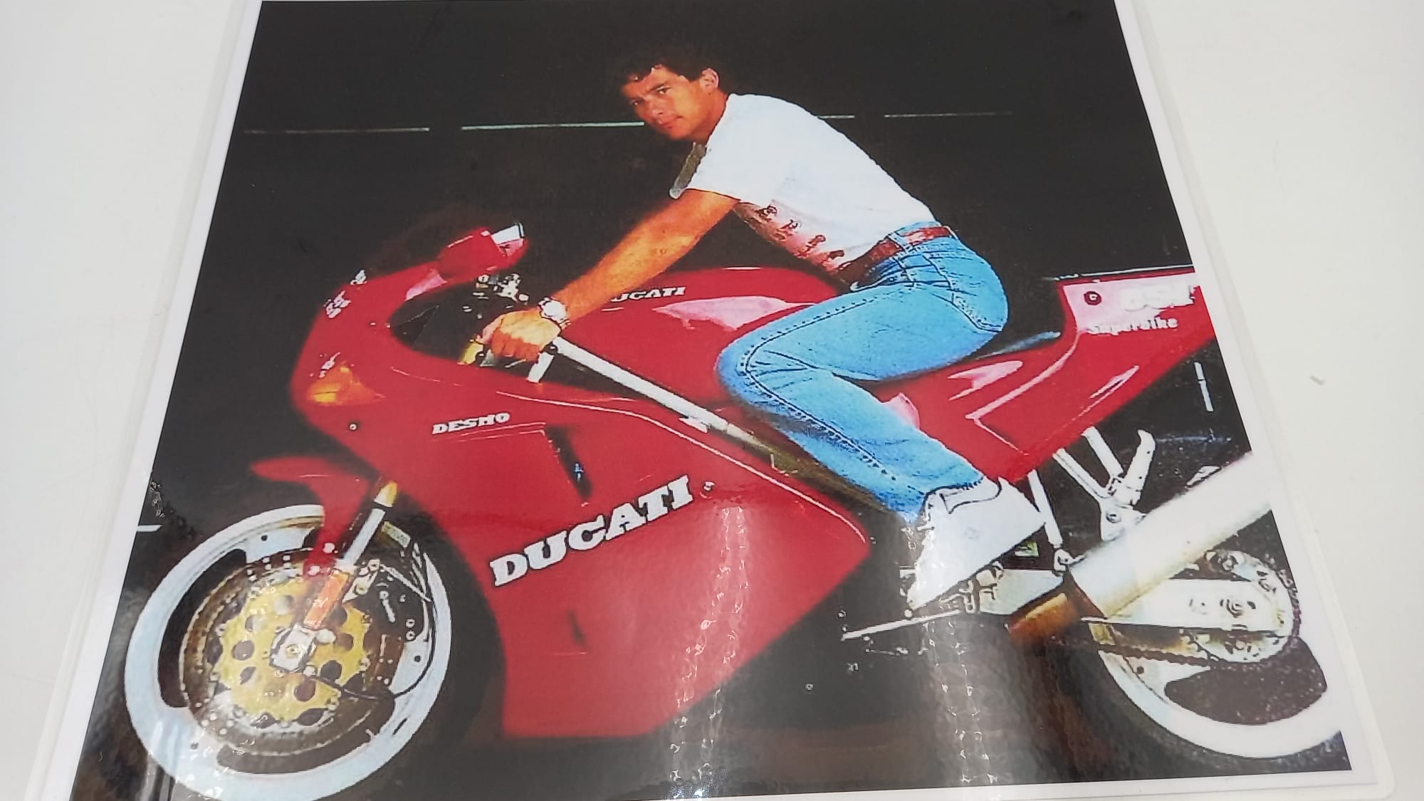 Stampa plastificata raffigurante Ayrton Senna su Ducati 851 Superbike In perfette condizioni, misure 33x30 cm