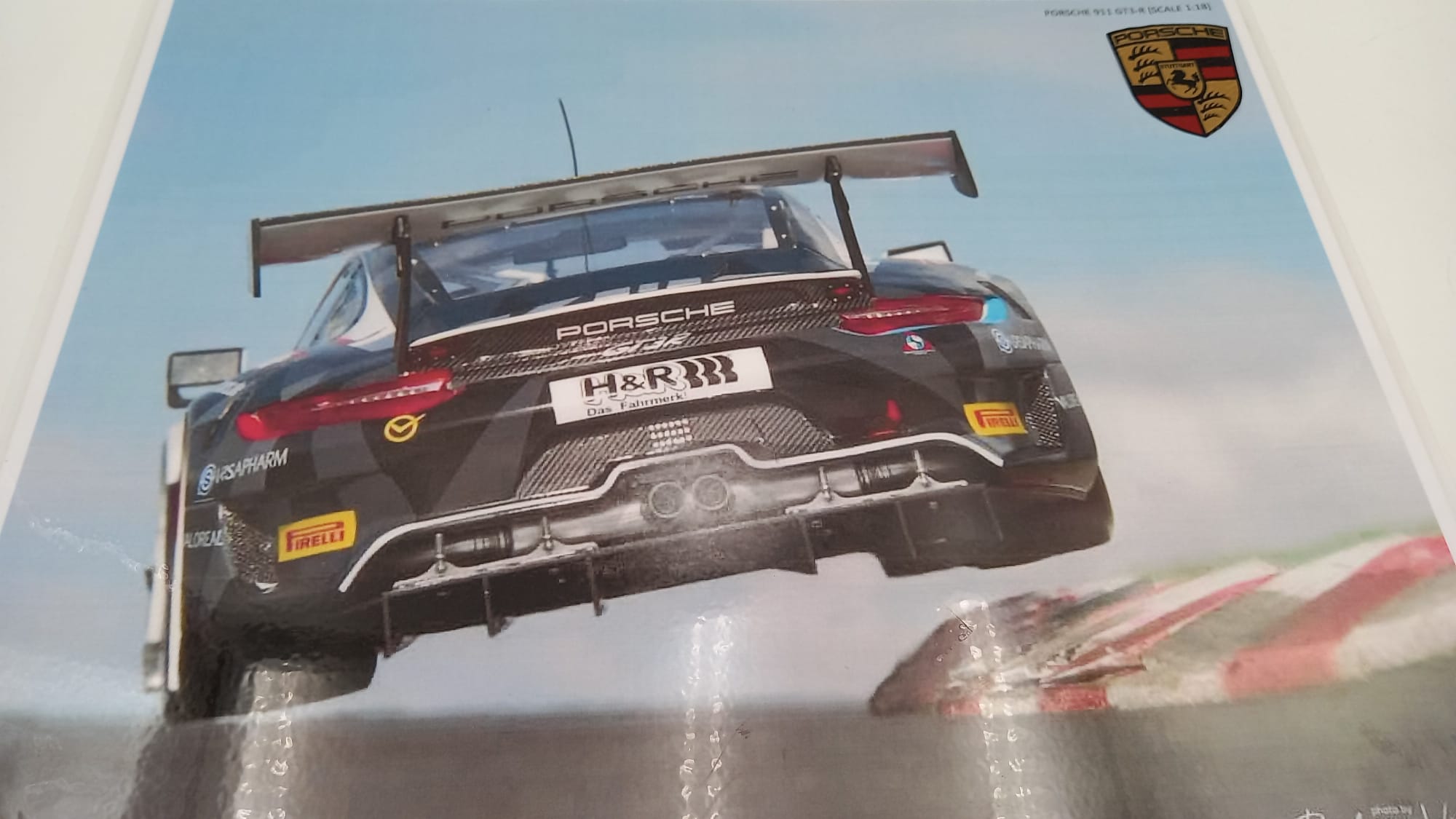 Stampa plastificata riproducente una Porsche 911 GT3-R in pista In perfette condizioni, misure 37x29 cm