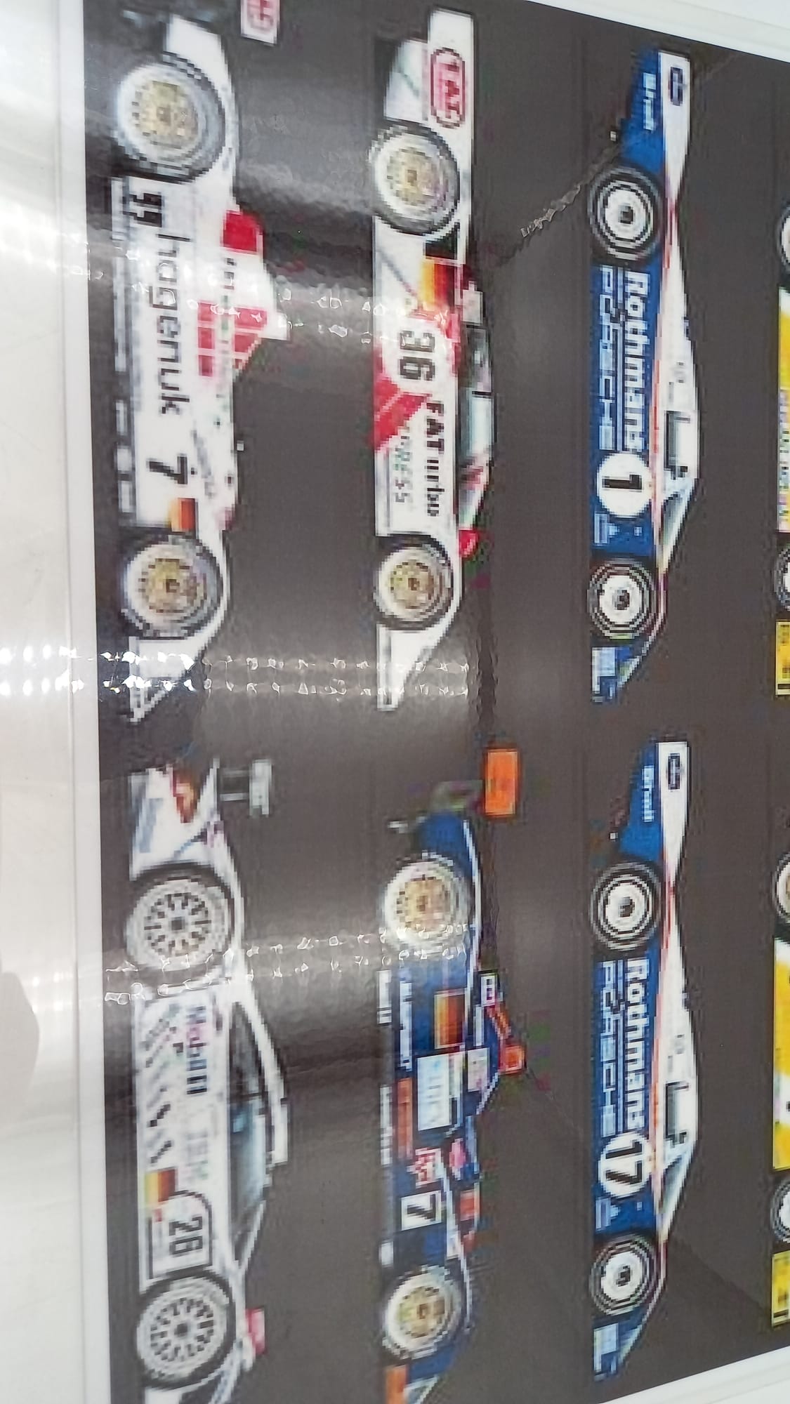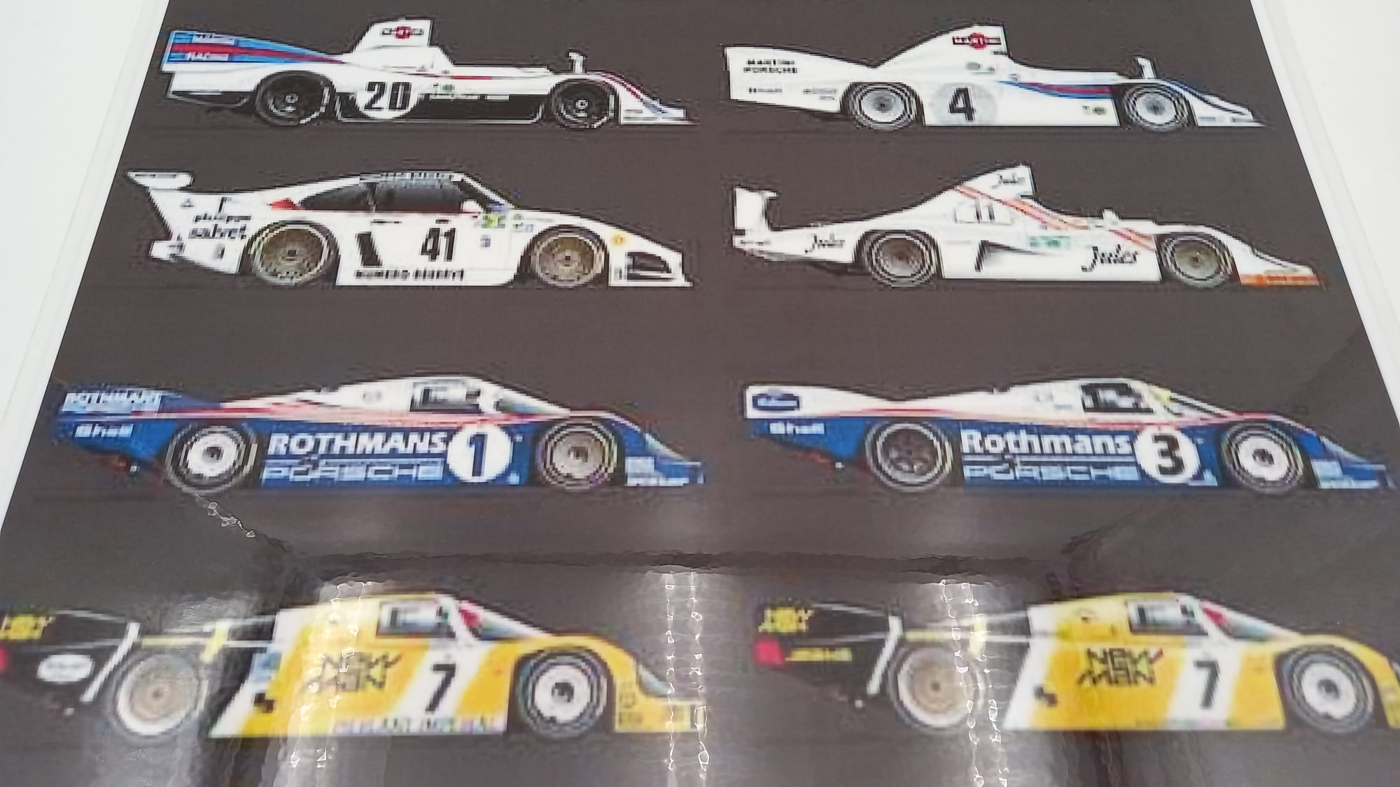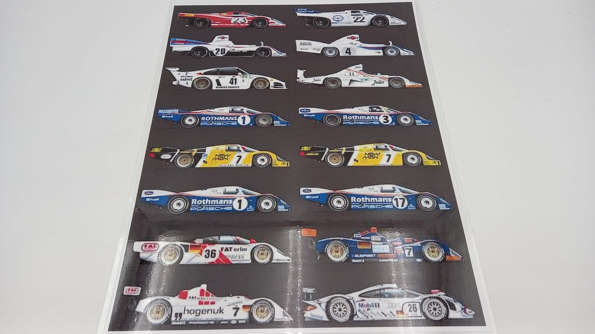 Stampa plastificata raffigurante diversi modelli Porsche da corsa In ottime condizioni, misure 29x40 cm