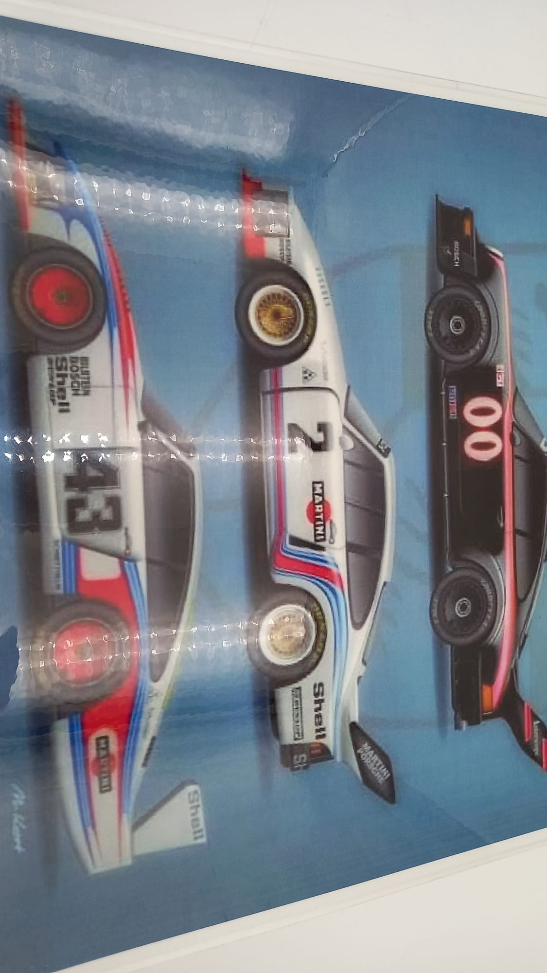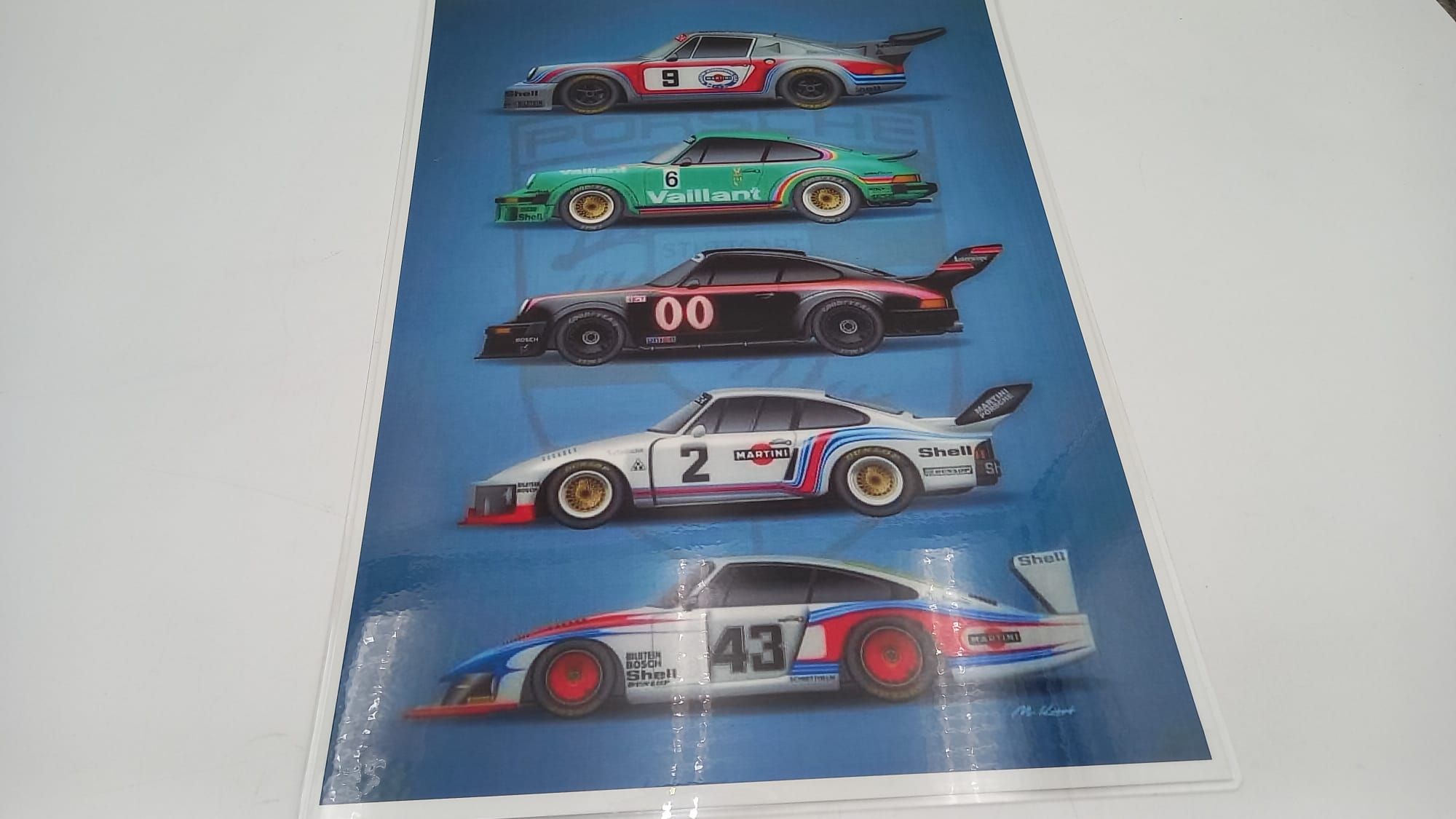 Stampa plastificata raffigurante diversi modelli Porsche da corsa In ottime condizioni, misure 29x40 cm