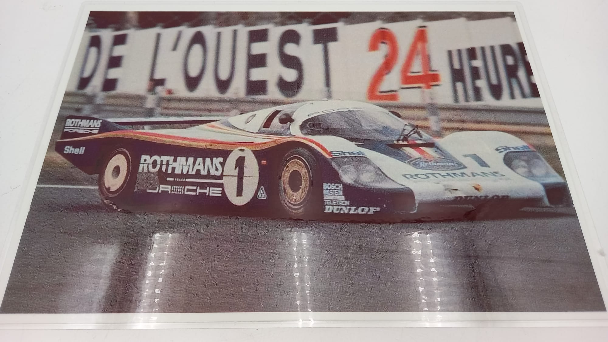 Stampa plastificata riproducente una Porsche 956 con livrea Rothmans In perfette condizioni, misure 30x21 cm