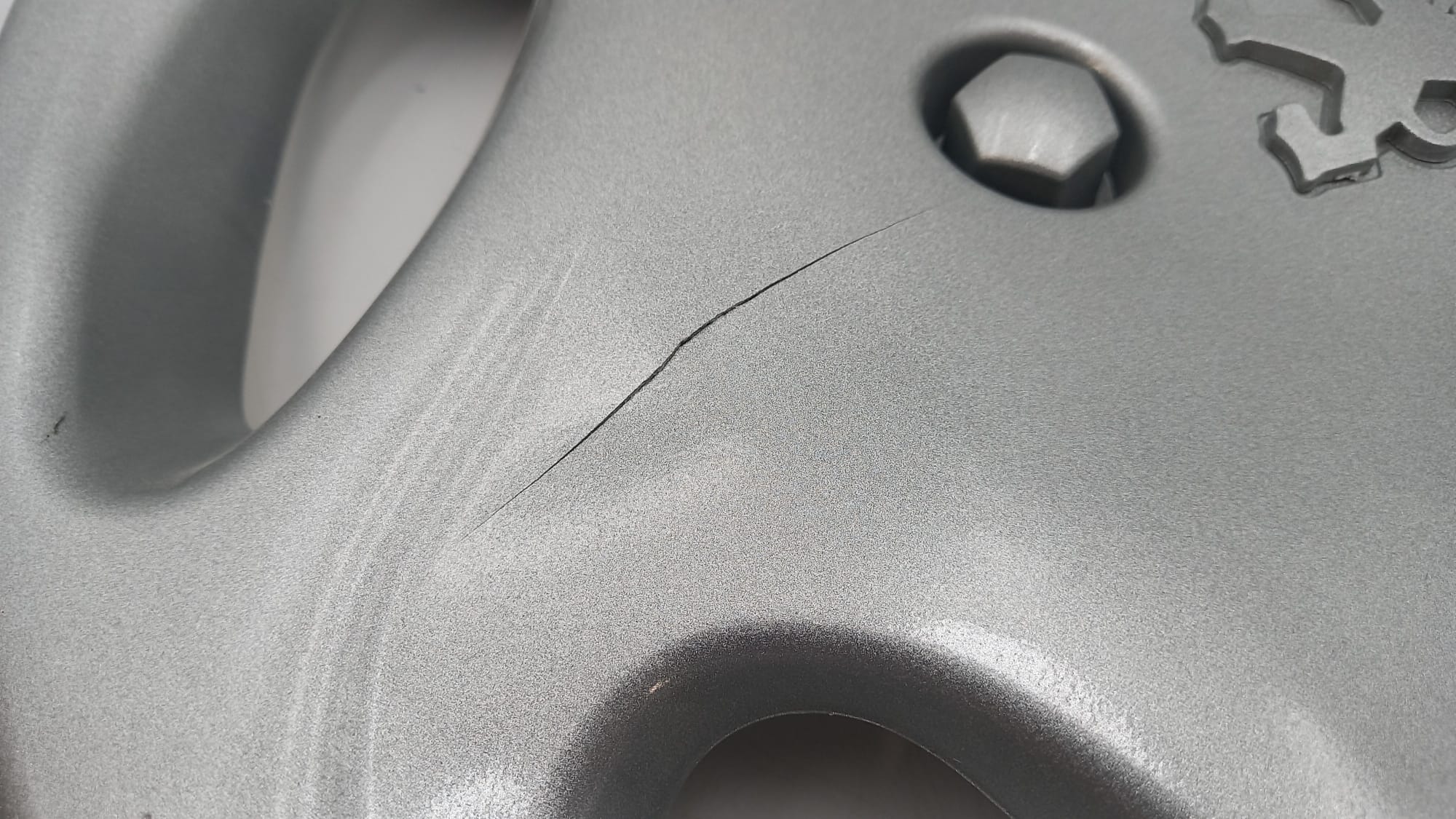 Copri cerchione originale Peugeot per modelli 206, 106, 306, 406, 806 Presenta una rottura come si vede in foto