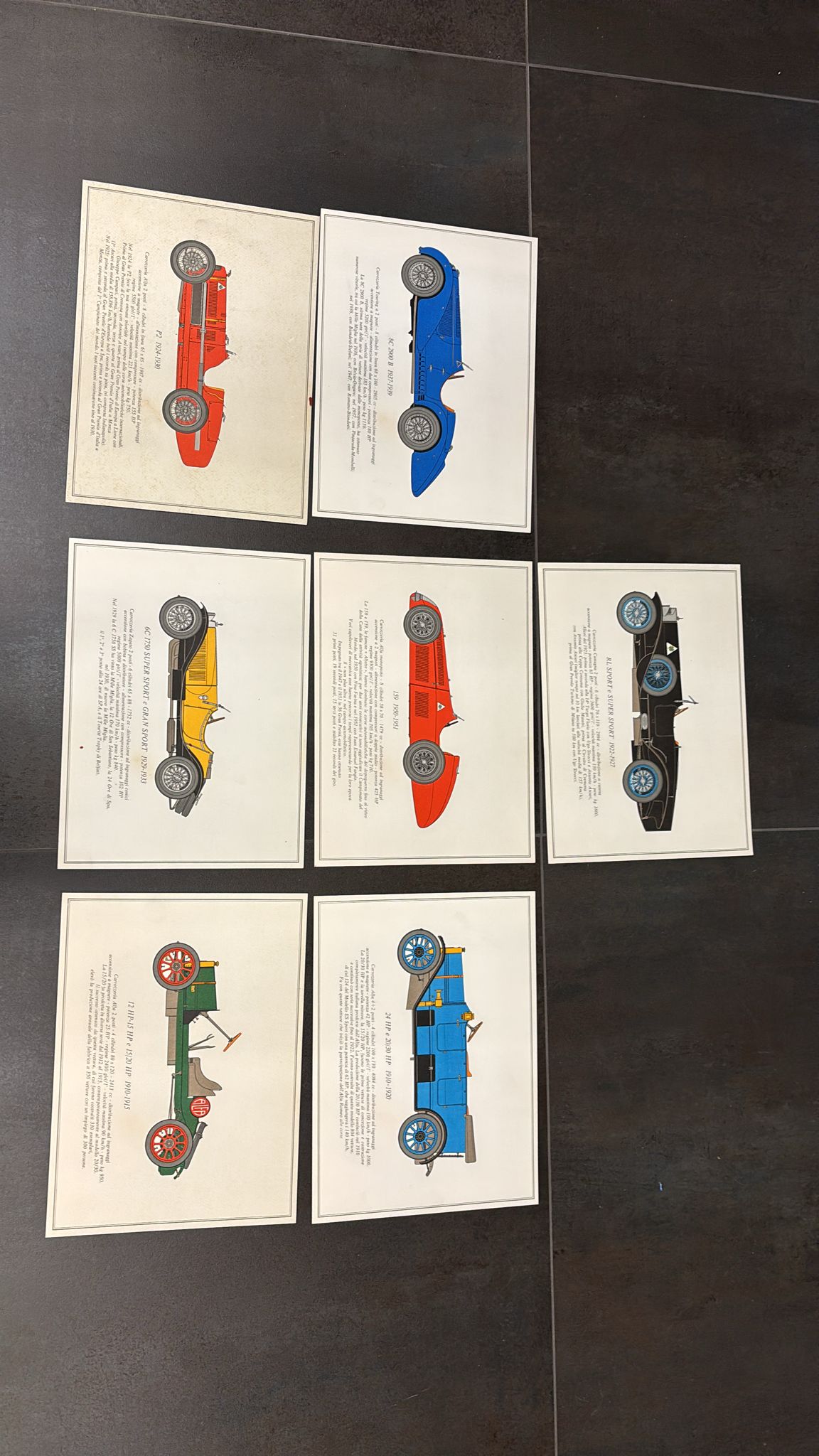 Lotto di 7 illustrazioni con descrizione di auto d'epoca Alfa Romeo di periodo '10-'50 Dimensioni illustrazioni 31x21,5