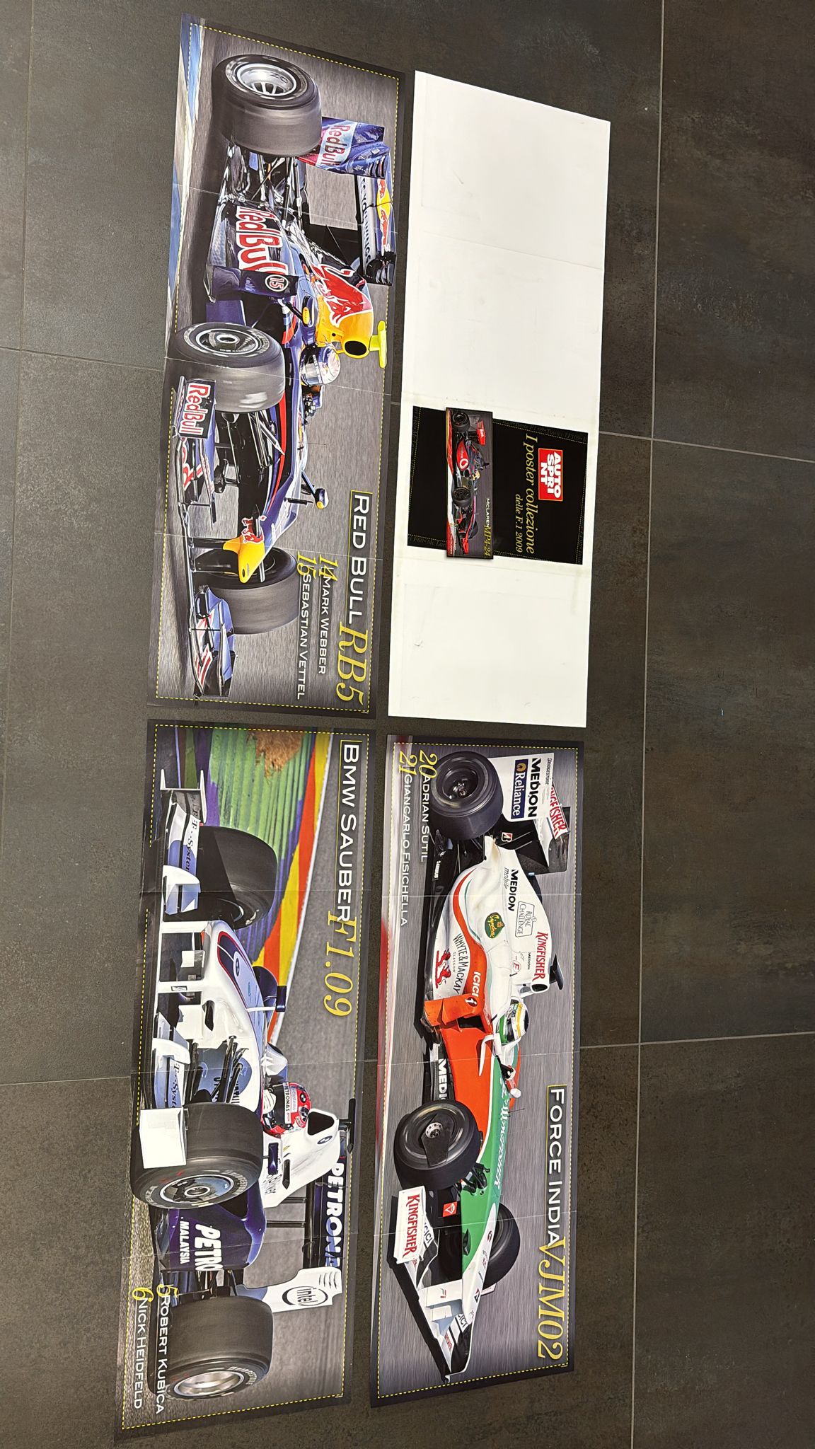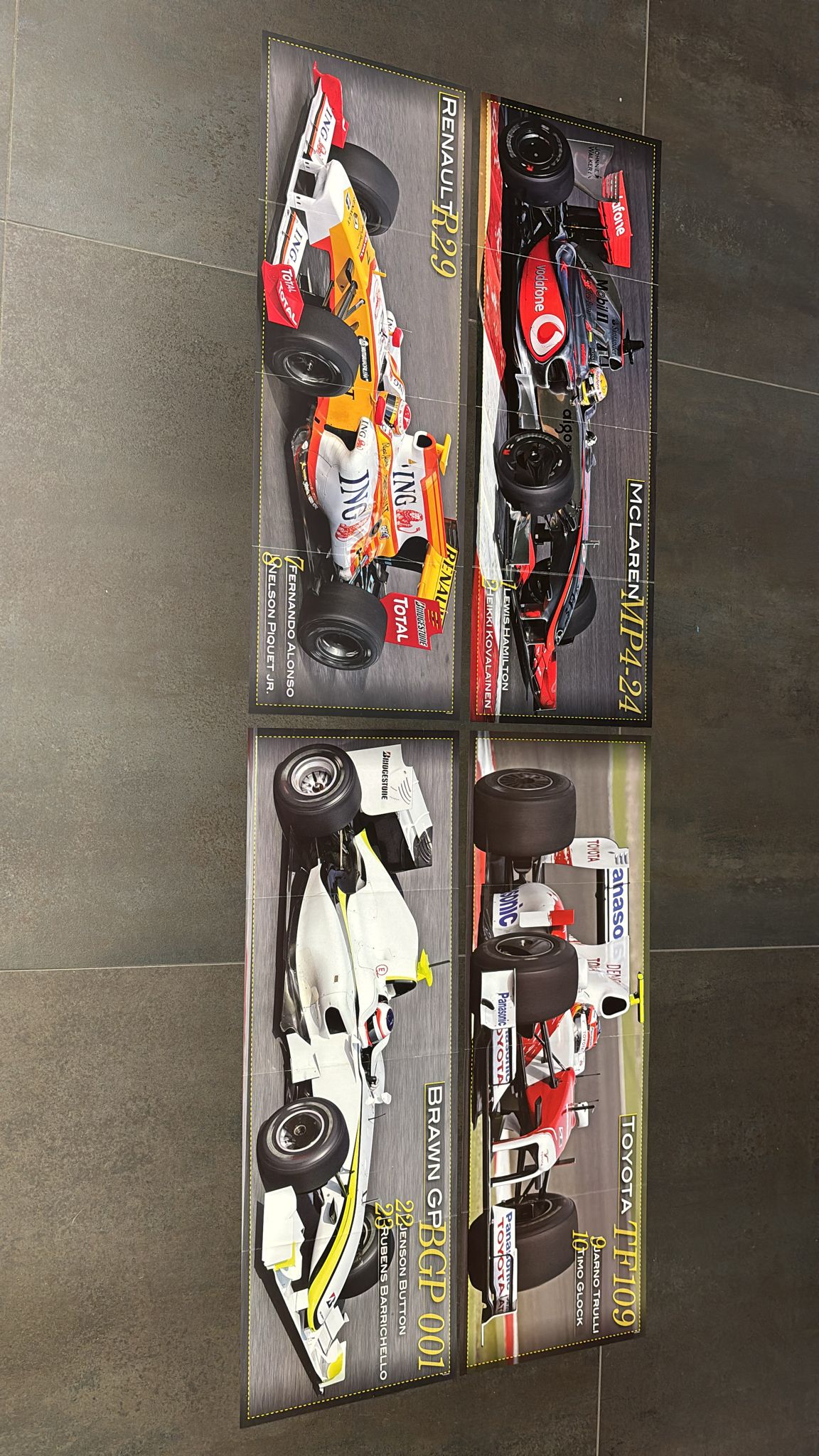 Lotto di 4 poster fronte/retro con immagini di vetture Formula 1 con nomi dei piloti, nello specifico: McLaren MPA-24, Toyota TF109, Renault R29, Brawn GP BGP 001, Force India VJM02, Red Bull RB5, BMW Sauber F1.09