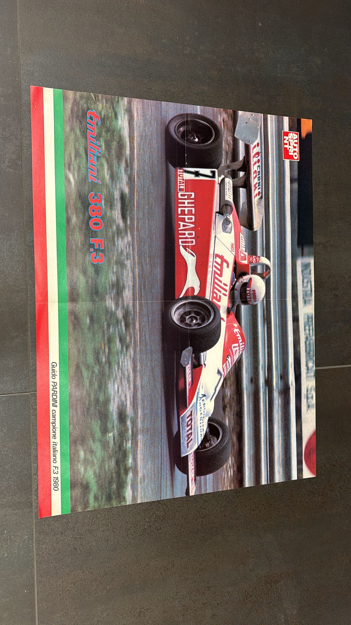 Poster raffigurante l'Emiliani 380 F.3 con alla guida Guido Pardini Dimensioni poster 60x46