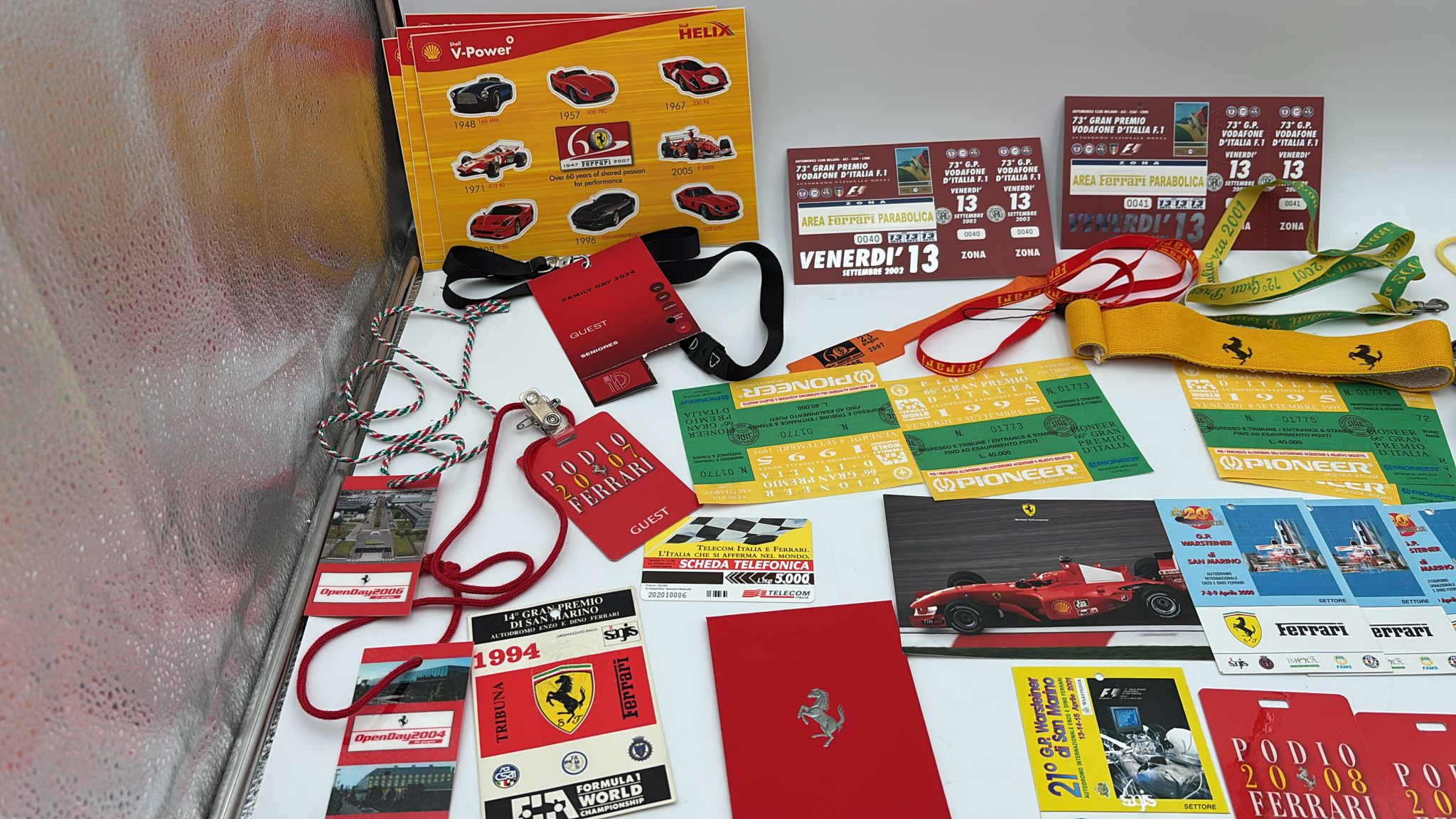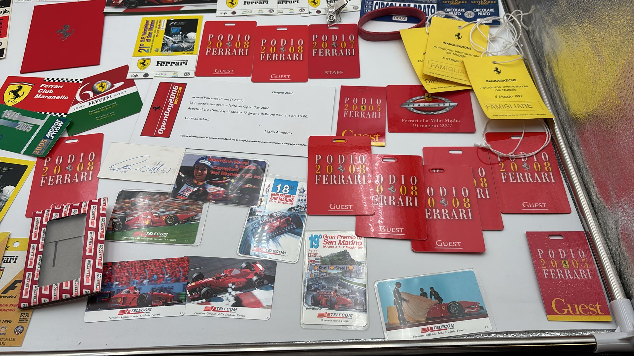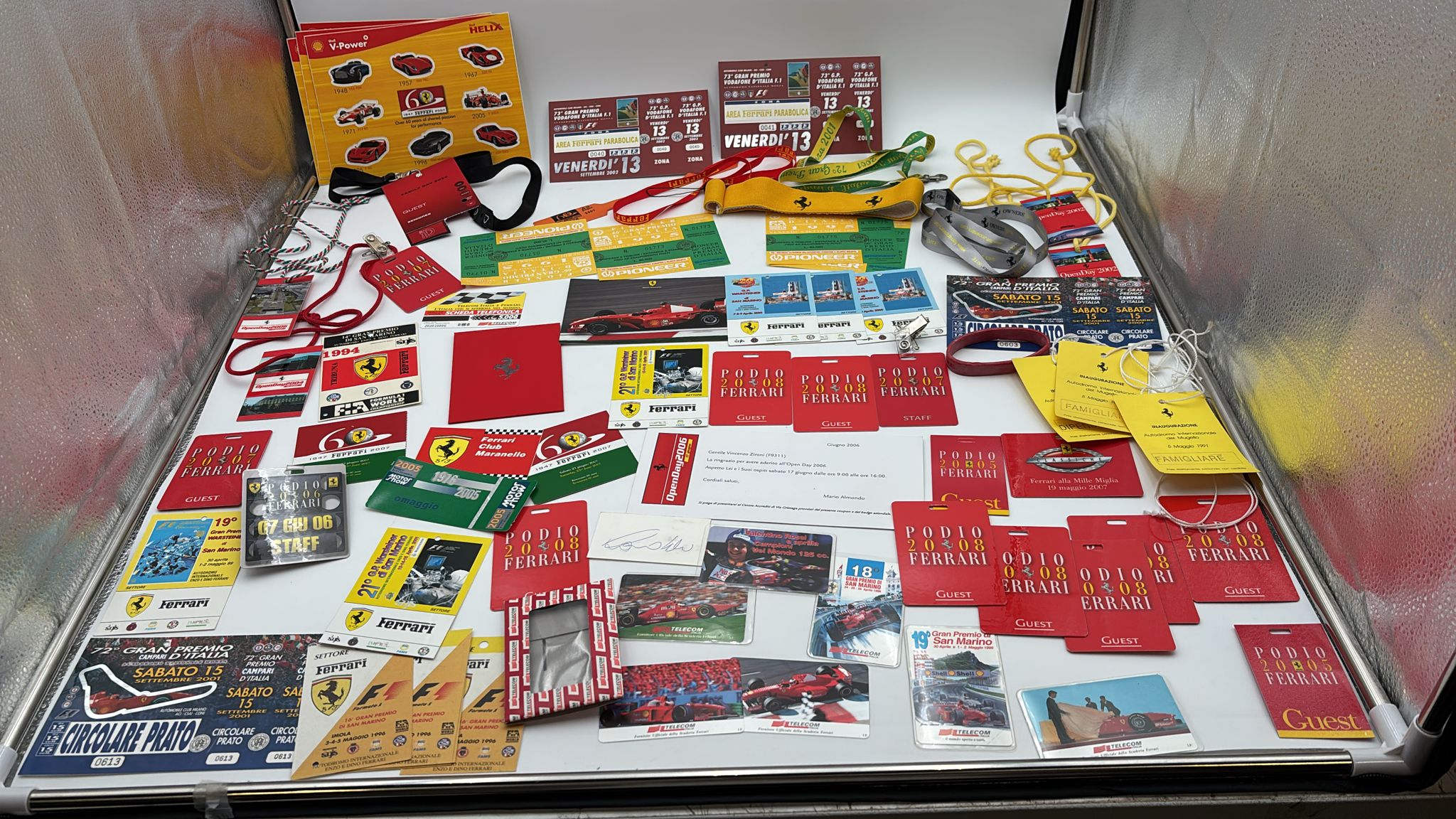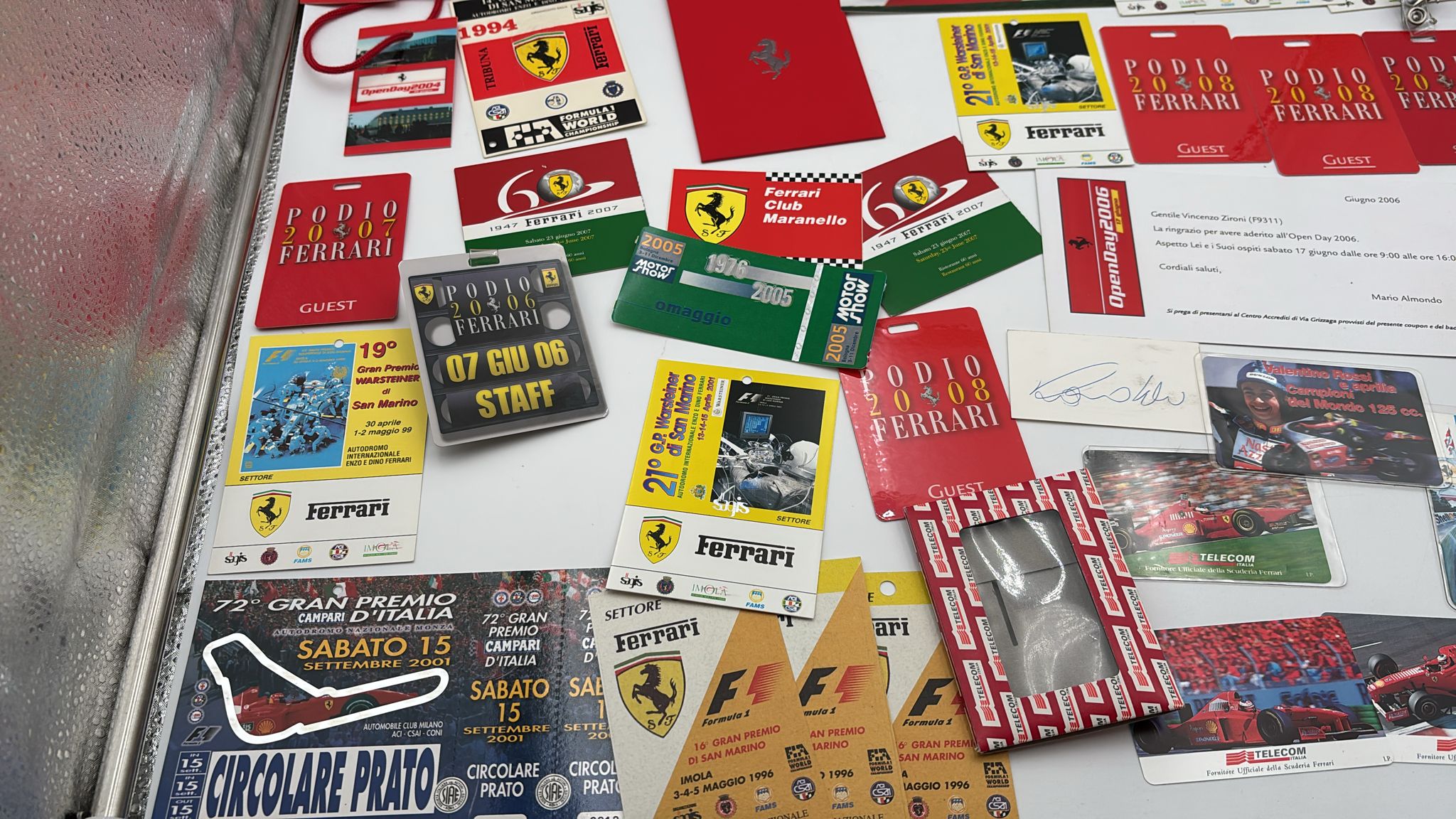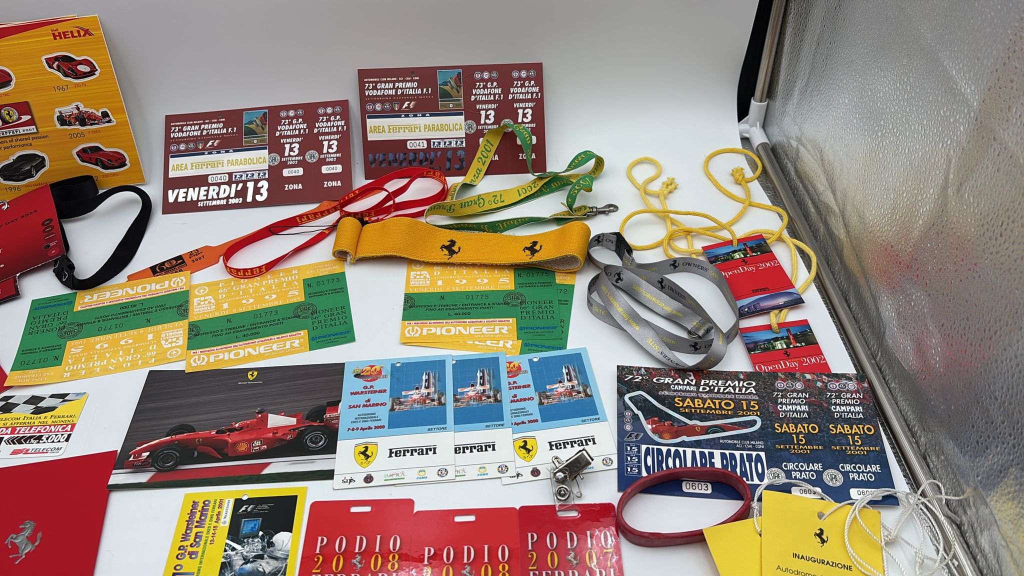 Lotto Memorabilia Ferrari tra cui Pass Podio Ferrari, schede telefoniche, cartoline