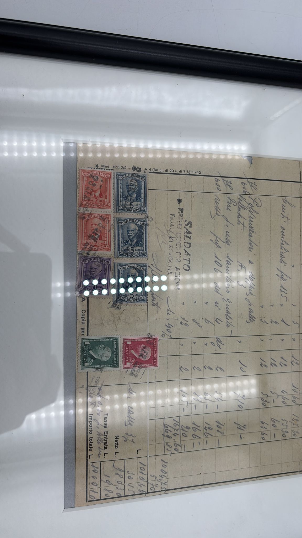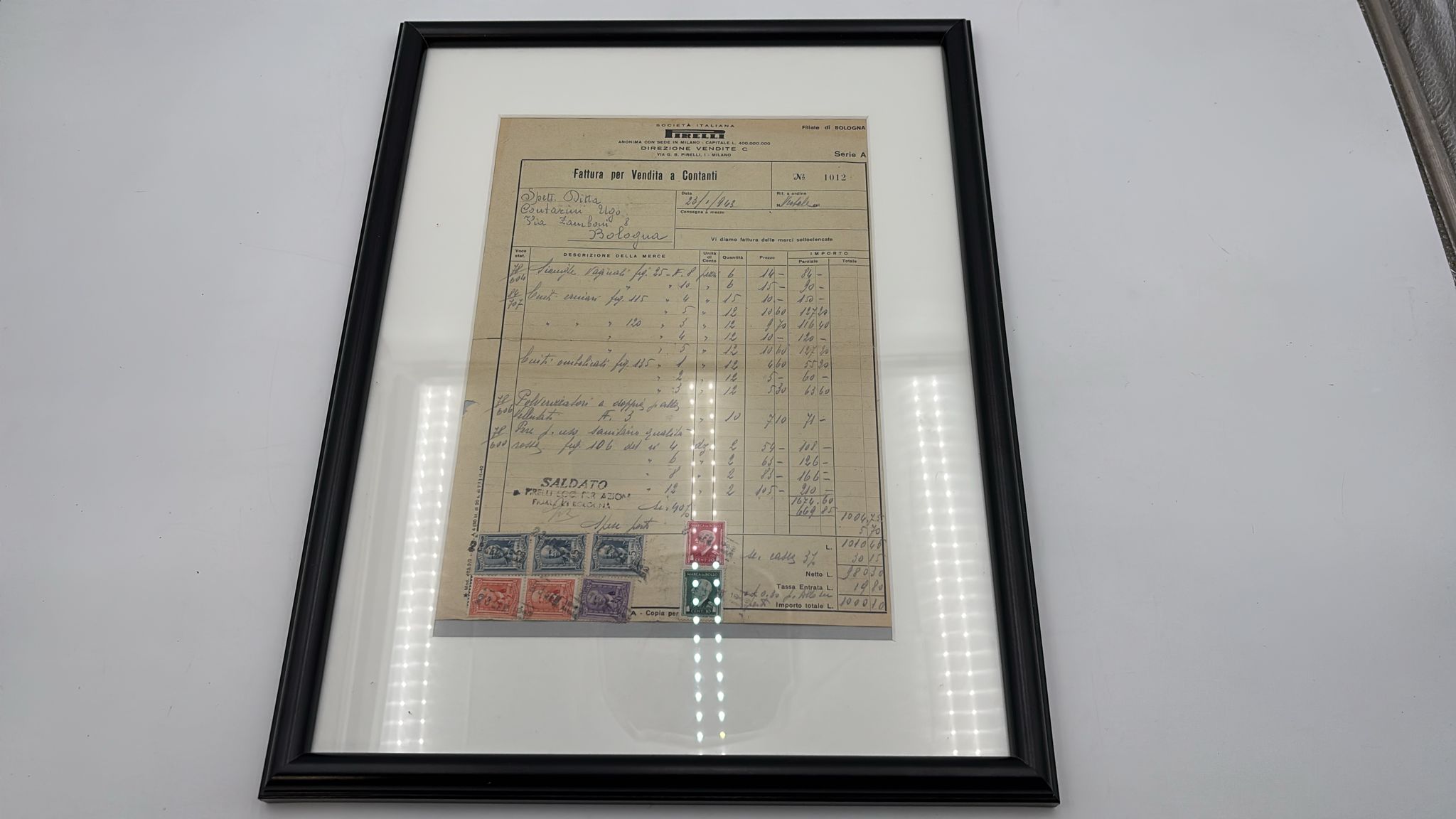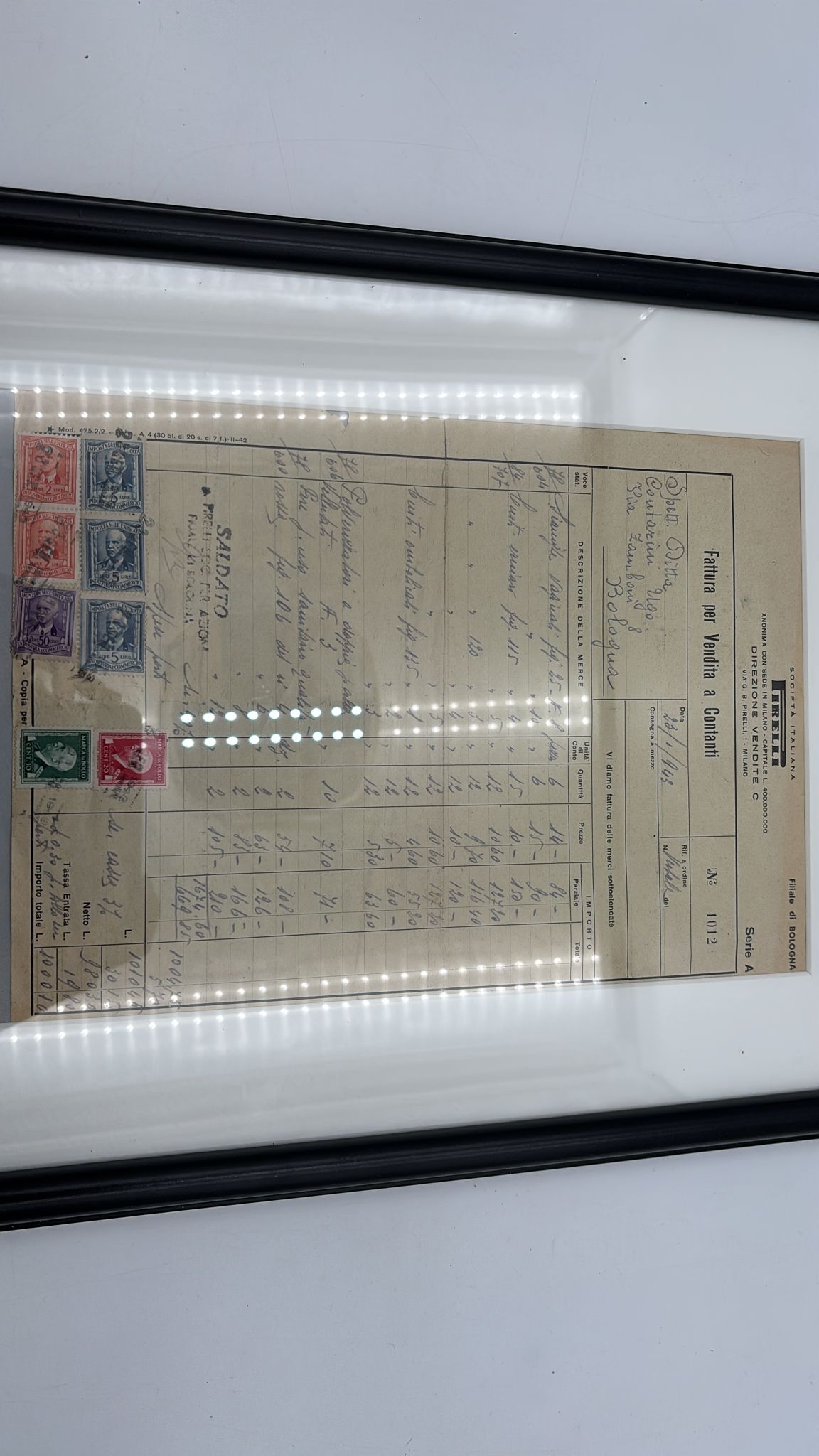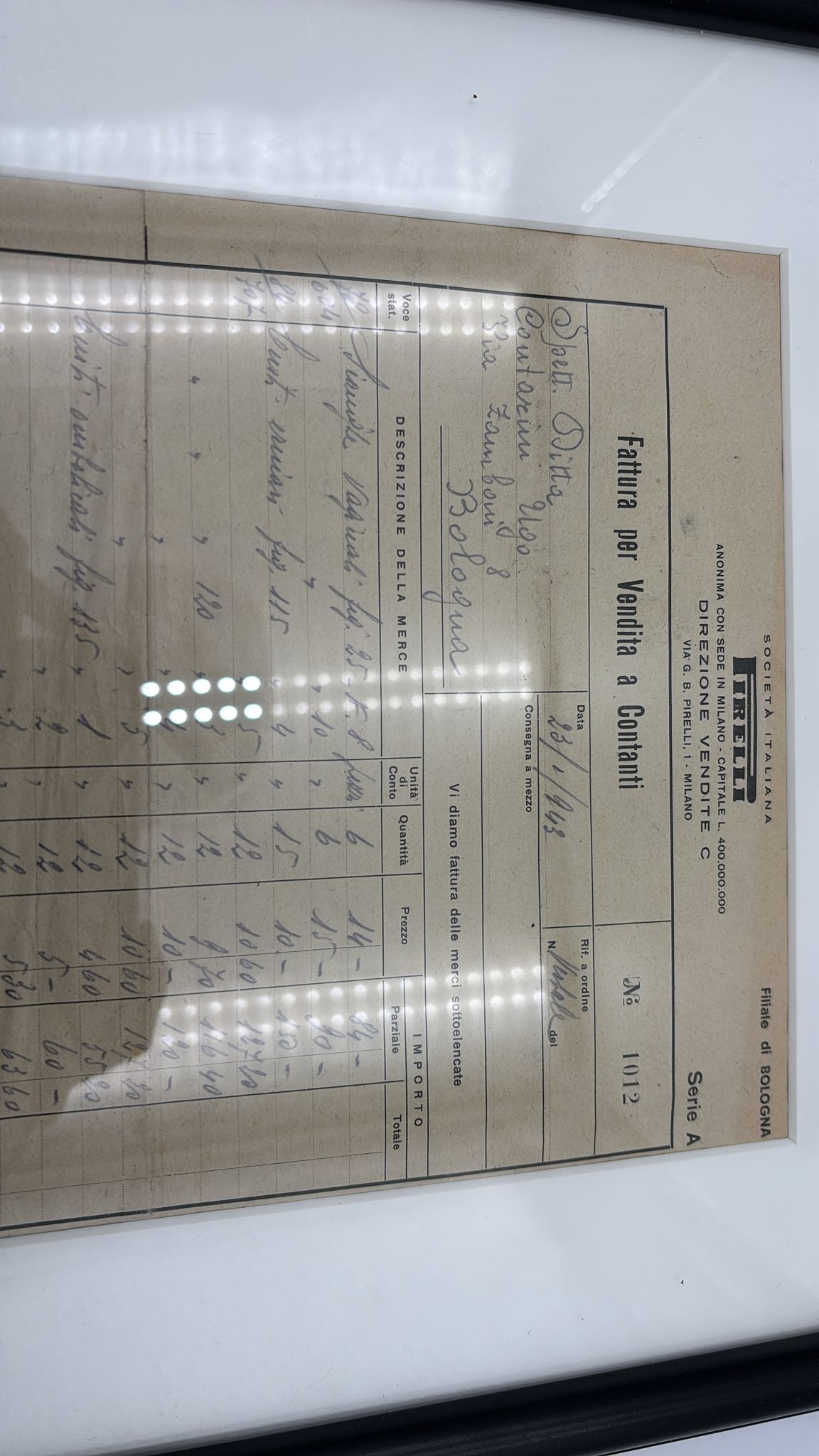 Fattura d'epoca incorniciata emessa dalla filiale di Bologna della Pirelli nel 1943. Dimensioni cornice 32x42