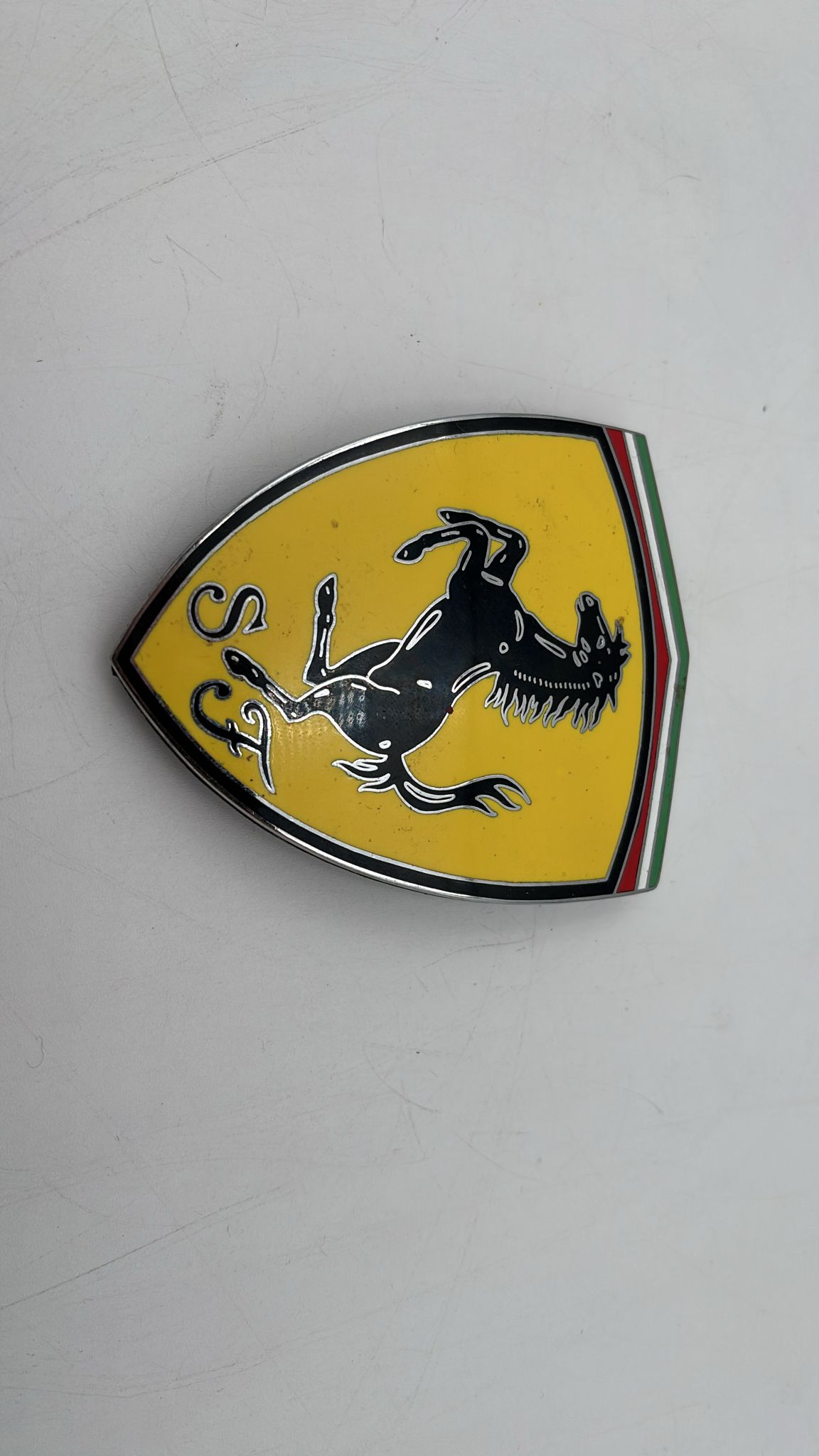 Stemma originale Ferrari. Segni di usura del tempo. Dimensioni 10x8 cm.
