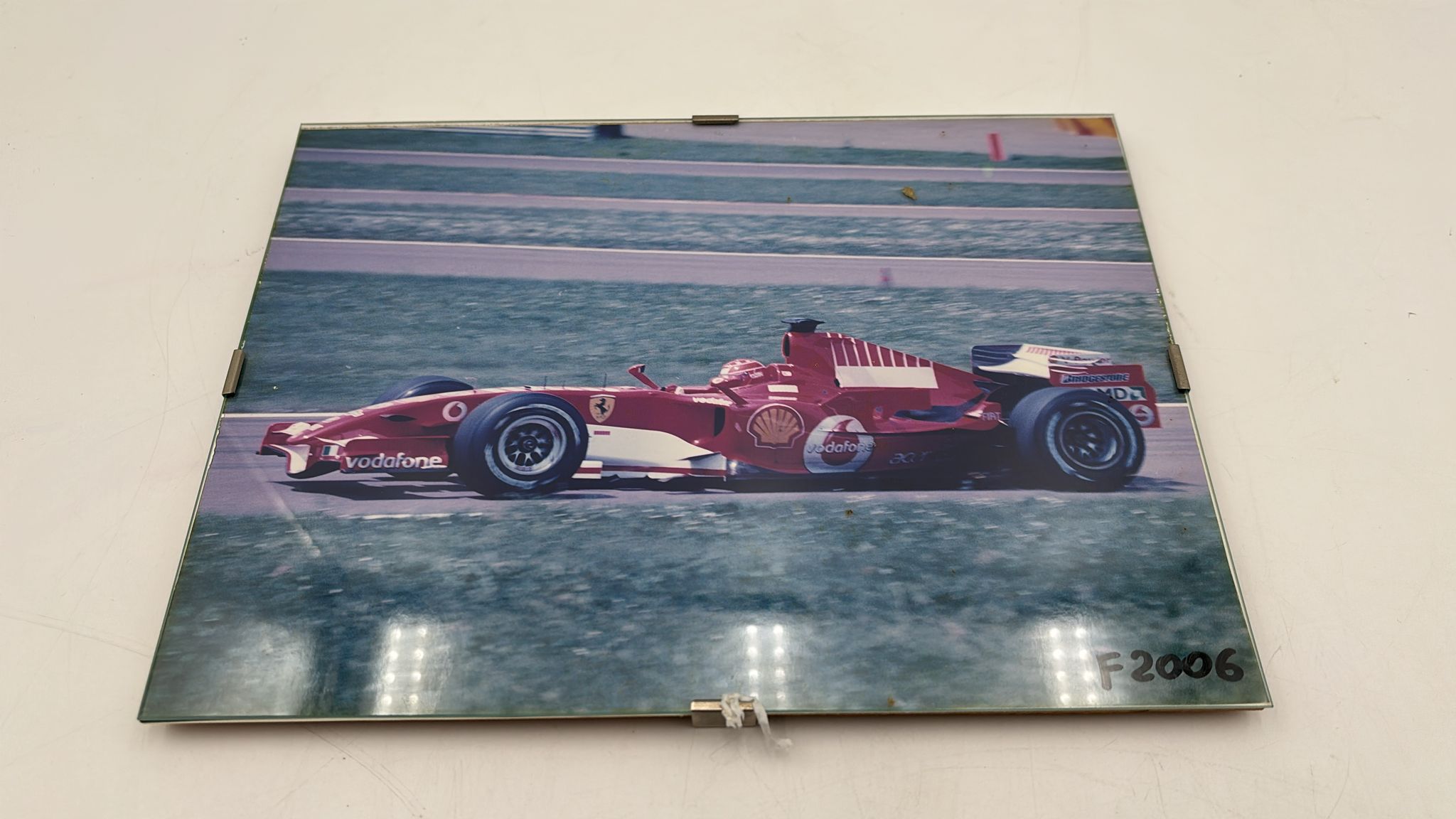 Foto incorniciata raffigurante la Ferrari F2006. Dimensioni: 12,5x 18,5cm. Vetro con segni del tempo.