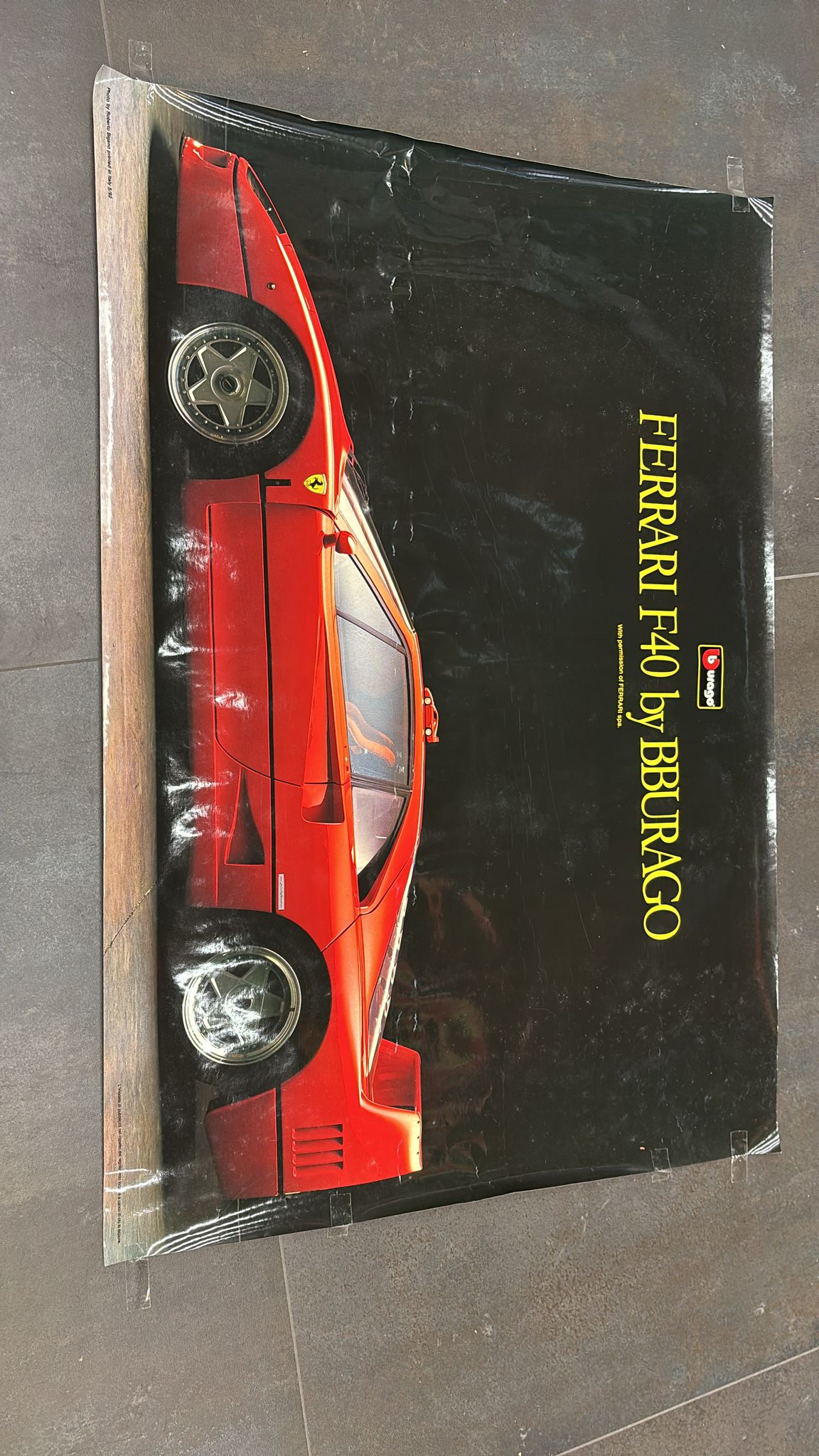 Poster ufficiale bburago raffigurante la Ferrari F40. Dimensioni: 100x68 cm. Leggermente usurato dal tempo.