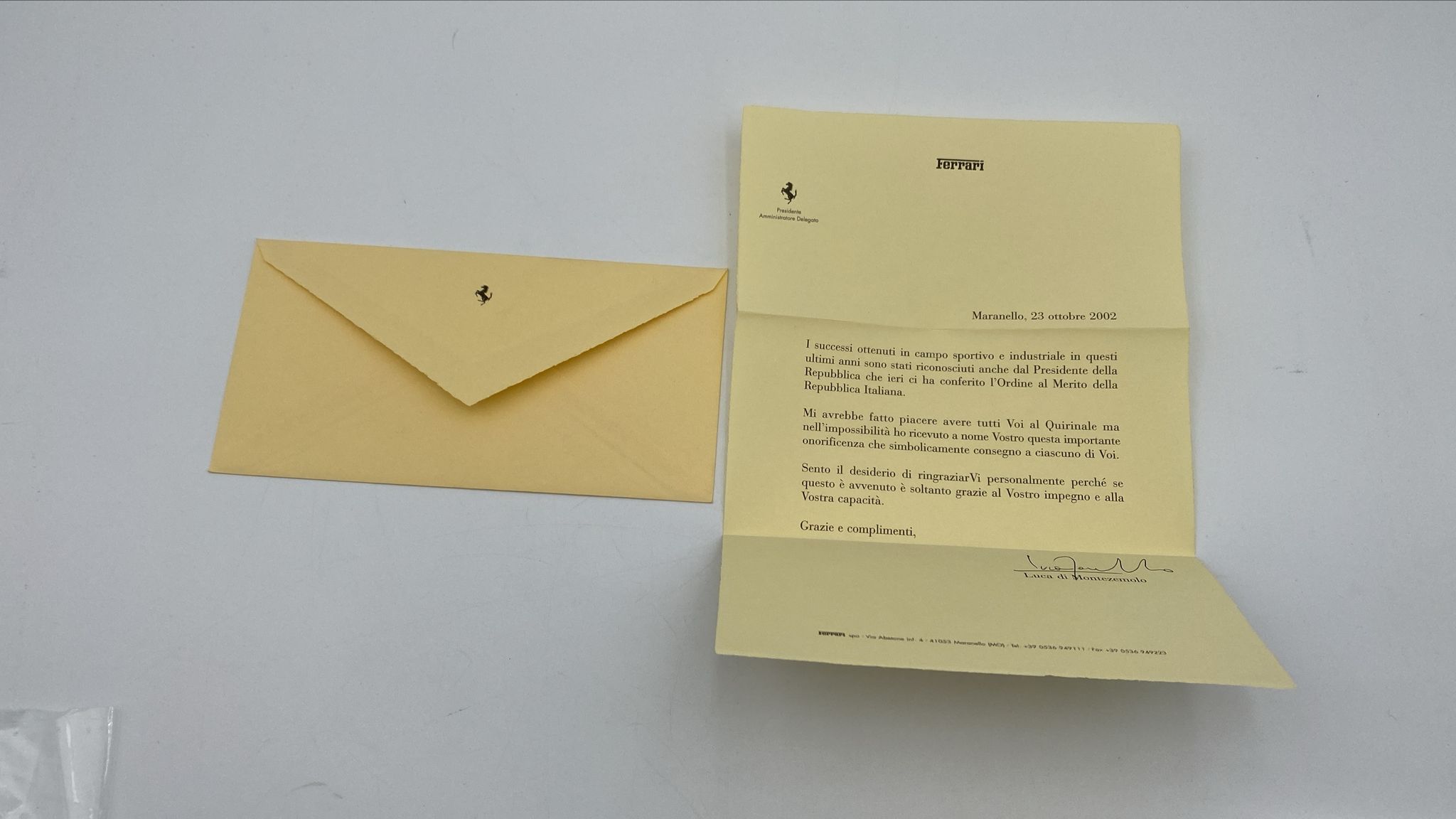 Lettera originale Ferrari del 2002 per il capo motorista Vincenzo Zironi