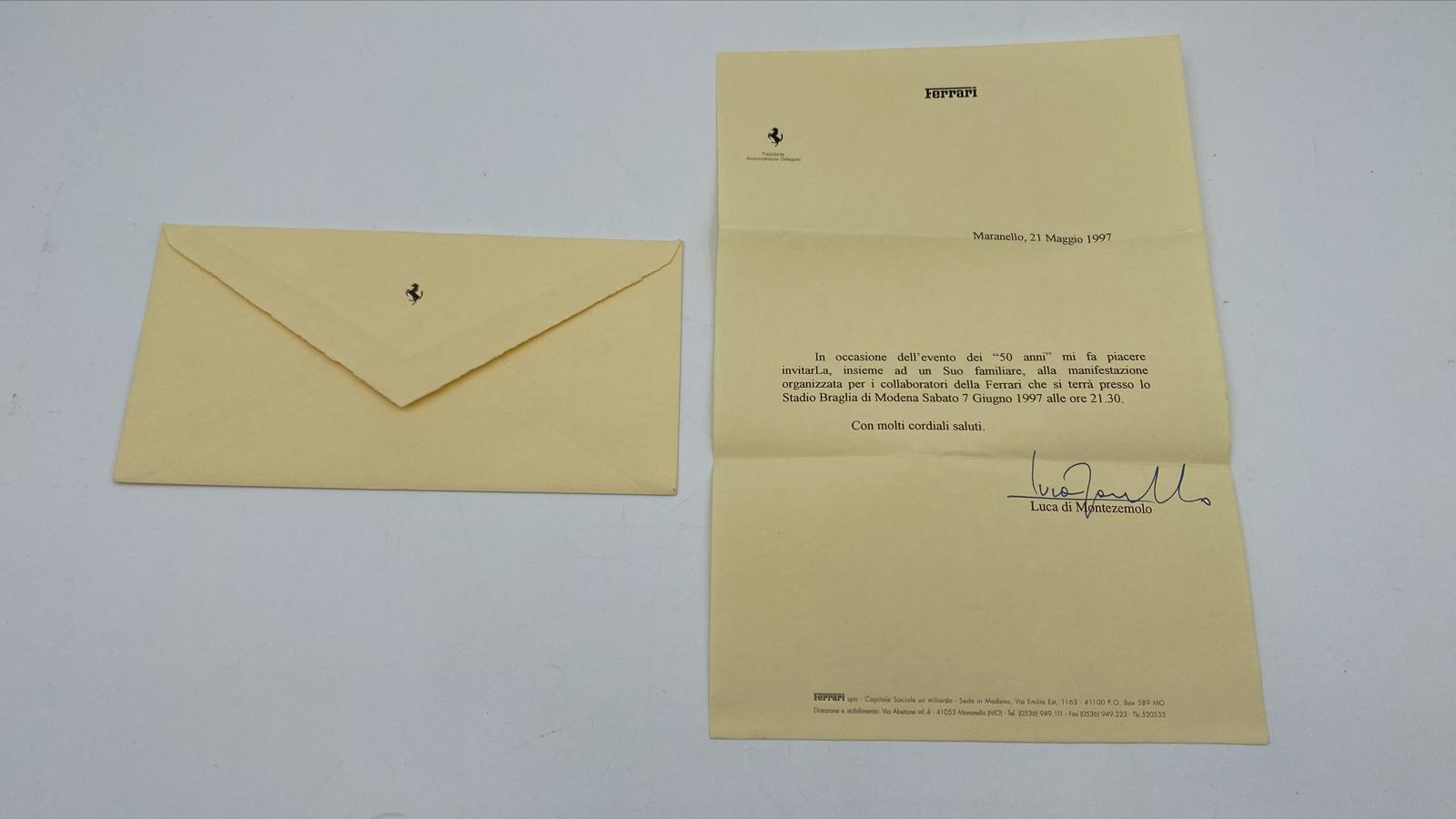 Lettera con invito all'evento dei 50 anni Ferrari del 1997 per il capo motorista Vincenzo Zironi