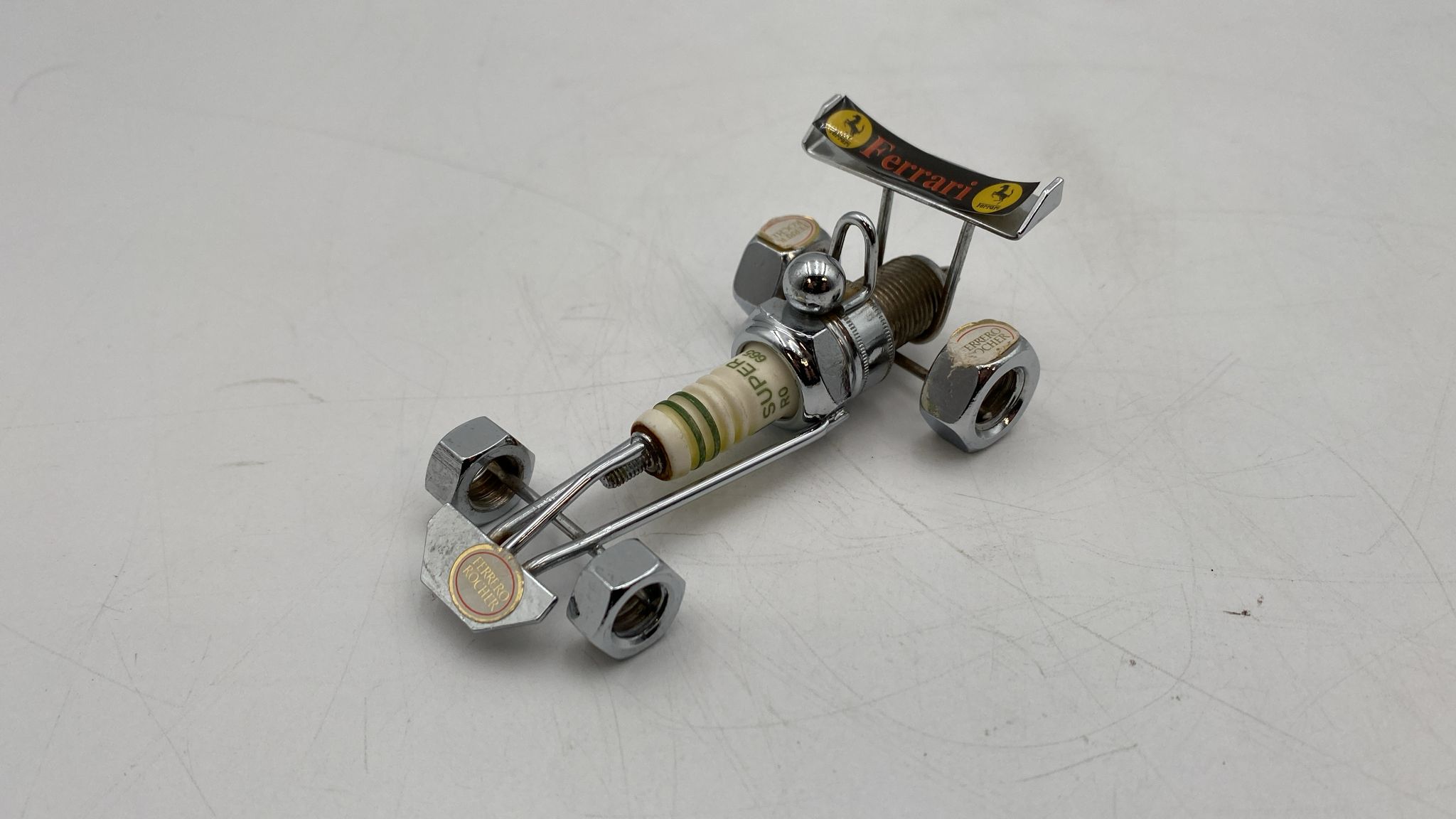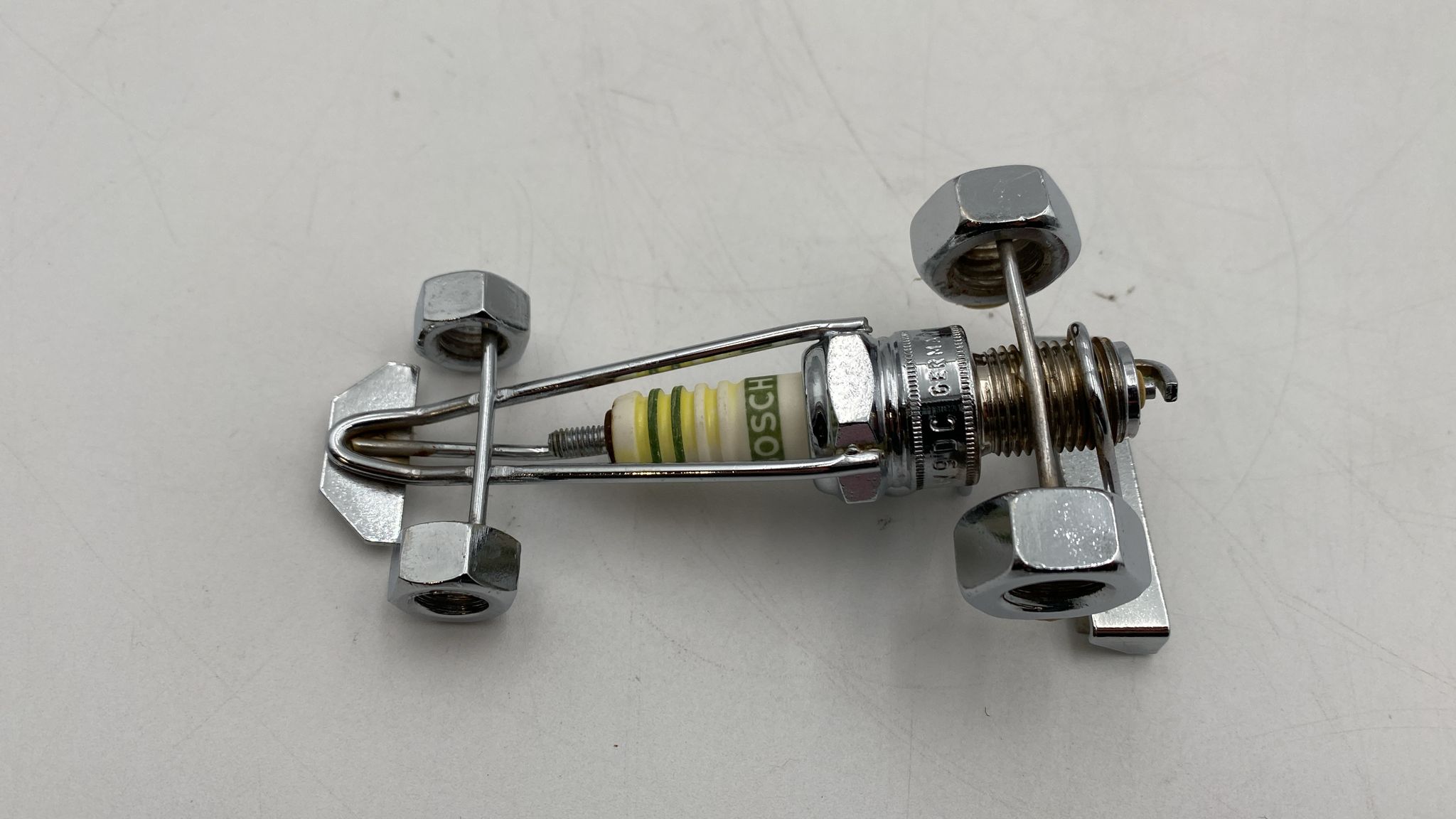 Scultura di una vettura Ferrari F1 realizzata con bulloni, dadi e una candela come corpo centrale