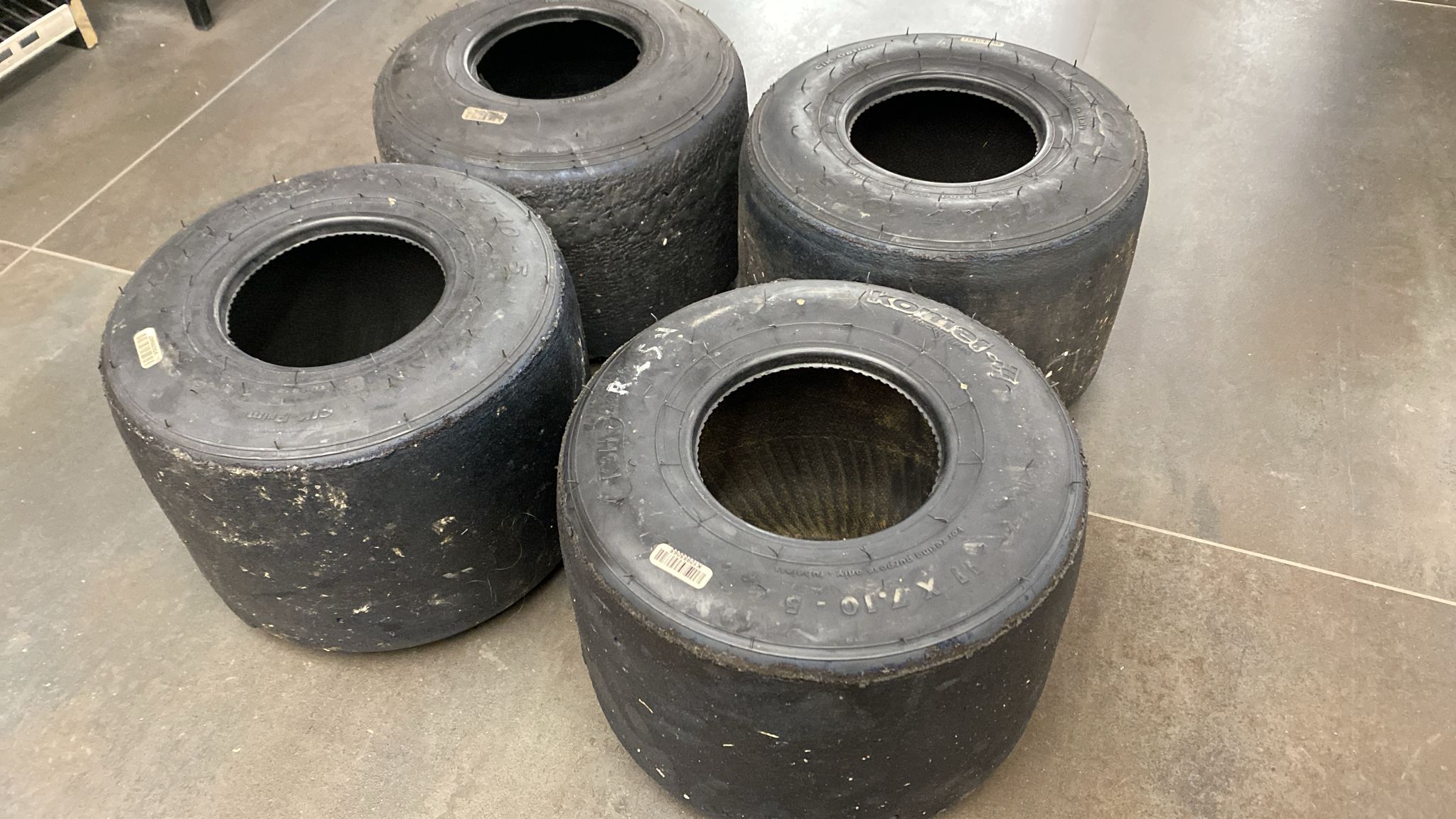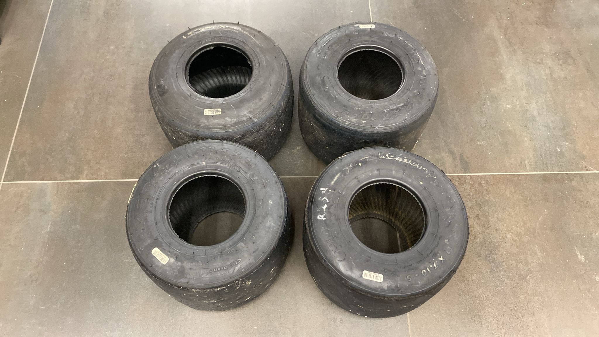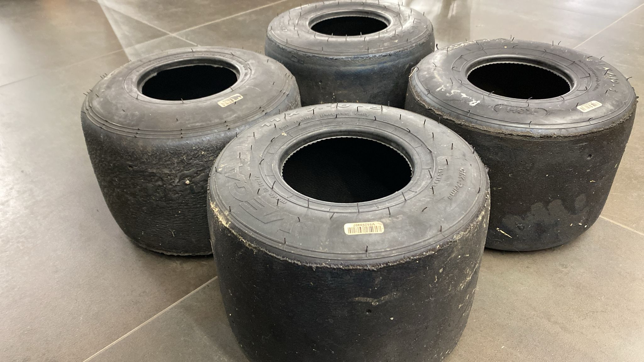 Set di quattro gomme utilizzate sul Kart di Charles Leclerc Presentano evidenti segni di utilizzo Diametro: 25 cm