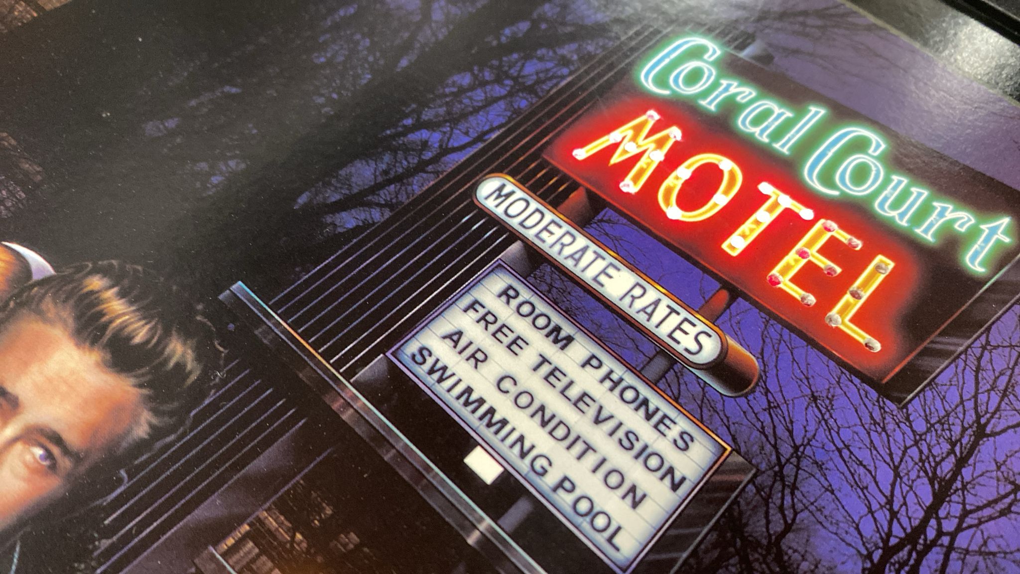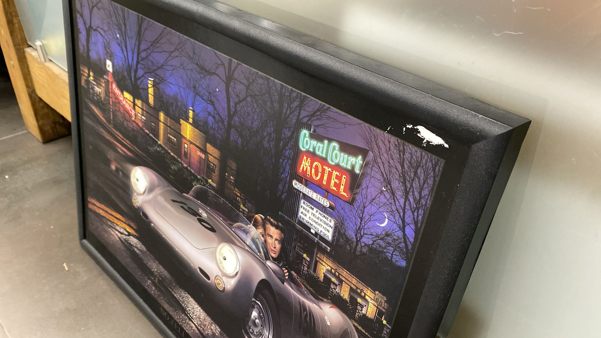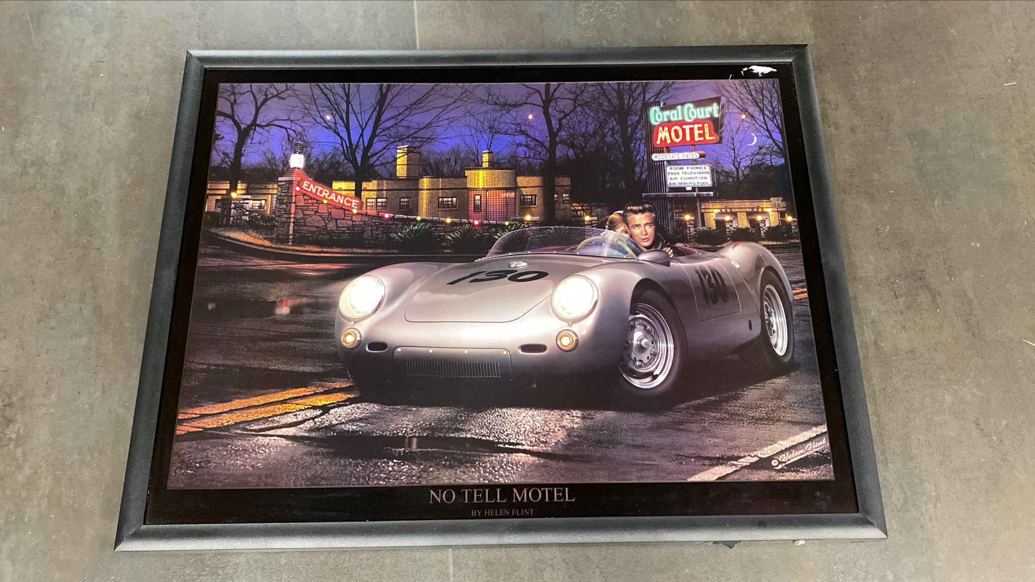 Raffigura James Dean alla guida di una Porsche 550 Spyder Fuori dal Coral Court Motel