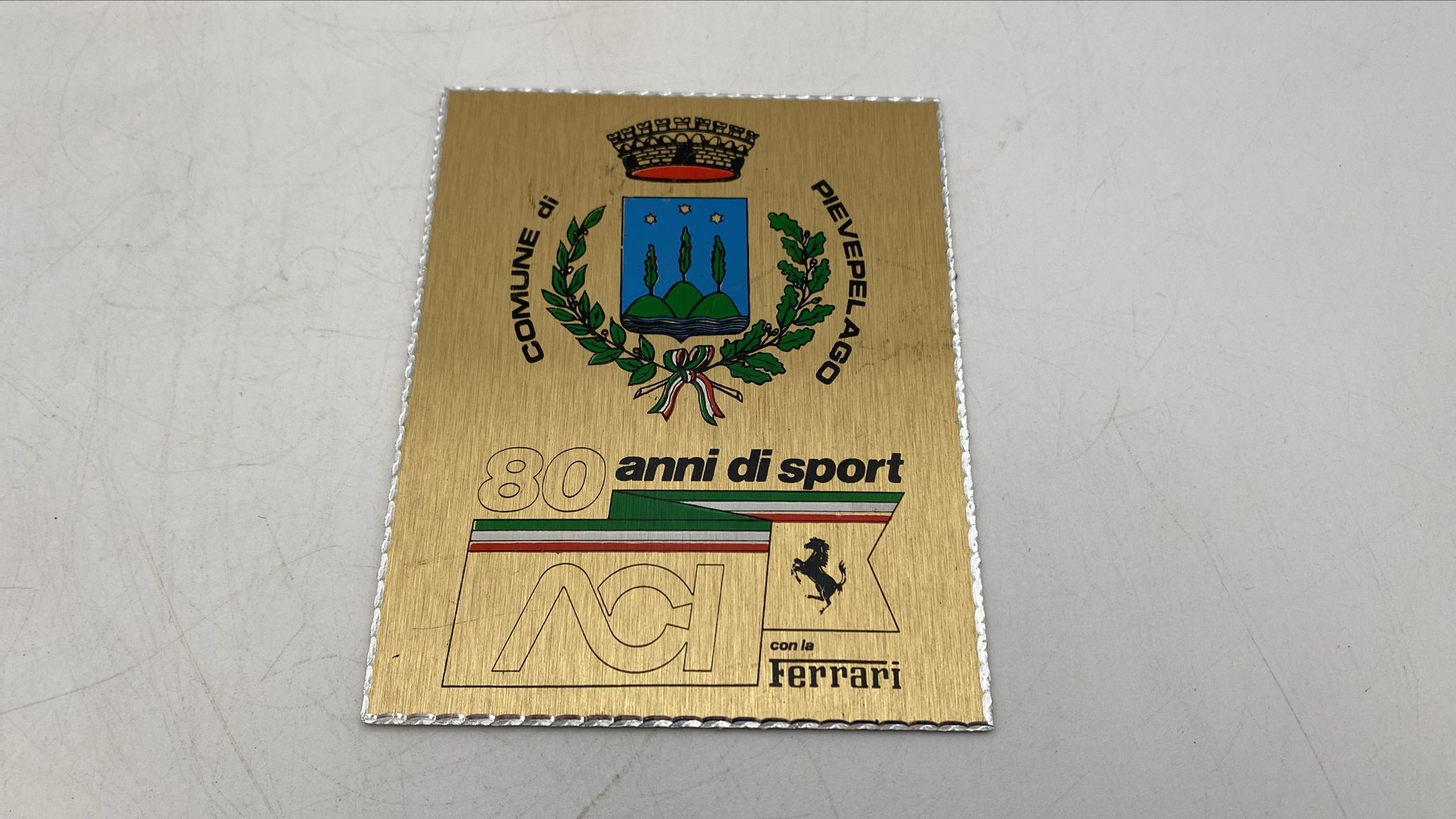 Targa commemorativa 80 anni di sport ACI con la Ferrari Comune di Pievepelago Misure: 12 x 9,5 cm Buone condizioni